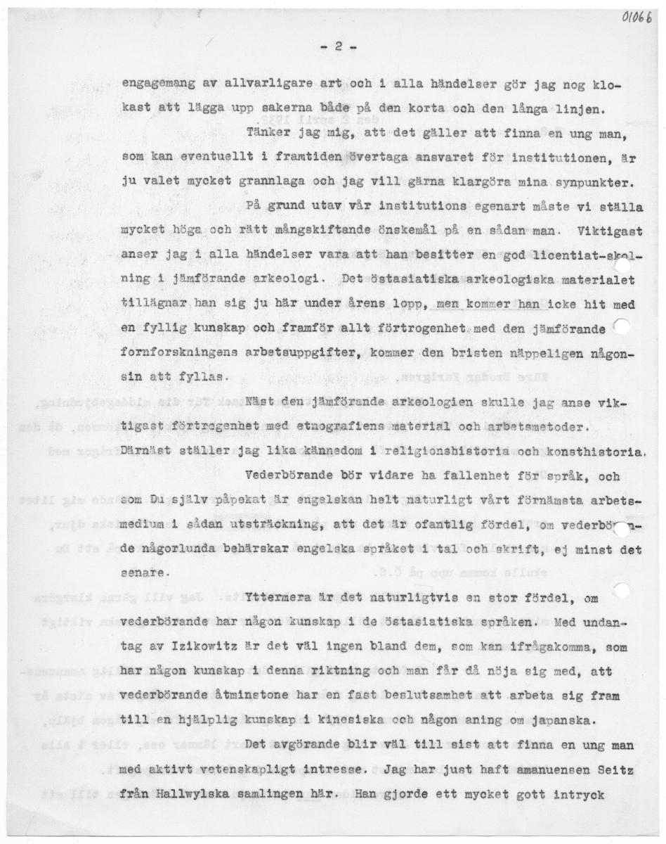 Ol06 b ” 2&- engagemang av allvarligare art och i alla händelser gör jag nog klo- kast att lägga upp sakerna både på den korta och den långa linjen. Tänker jag mig, att det gäller att finna en ung man, som kan eventuellt i framtiden övertaga ansvaret för institutionen, är ju valet mycket grannlaga och jag vill gärna klargöra mina. synpunkter. På grund utav vår institutions egenart måste vi ställa mycket höga och rätt mångskiftande önskemål på en sådan man. Viktigast anser jag i alla händelser vara att han besitter en god licentiat-skal. ning i jämförande arkeologi. Det-östaslatiska arkeologiska materialet tillägnar, han sig ju här under årens lopp, men kommer han icke hit med en fyllig kunskap och framför allt förtrogenhet.med den jämförande Ko foranforskningens arbetsuppgifter, kommer den bristen näppeligen någon- sin att fyllas. Näst den :jämförende. arkeologien skulle jag anse vik. tigast förtrogenhet med etnograftiens material och arbetsmetoder. Därnäst ställer jag lika kännedom i religionshbhistoria och konsthistoria. Vederbörande bör vidare ha fallenhet för språk, och som Du själv påpekat är engelskan helt naturligt vårt förnämsta arbets. medium i sådan utsträckning, att det är ofantlig fördel, om vederbör n= de någorlunda behärskar engelska språket i tal och skrift, ej minst det senare. YTttermera är det naturligtvis en stor fördel, om vederbörande har någon kunskap i de östasiatiska språken. Med undan- tag av Izikowitz är det väl ingen bland dem, som kan ifrågakomma, som har någon kunskap I denna riktning och man får då nöja sig med, att vederbörande åtminetone har en fast beslutsemhet att arbeta sig fram till en hjälplig kunskap i kinesiska och någon aning om japanska. Det avgörande blir väl till sict att finna en ung man med aktivt vetenskapligt intresse, Jag har just haft amanuensen Seitz från Hallwylska samlingen här. Hen gjorde ett mycket gott intryck