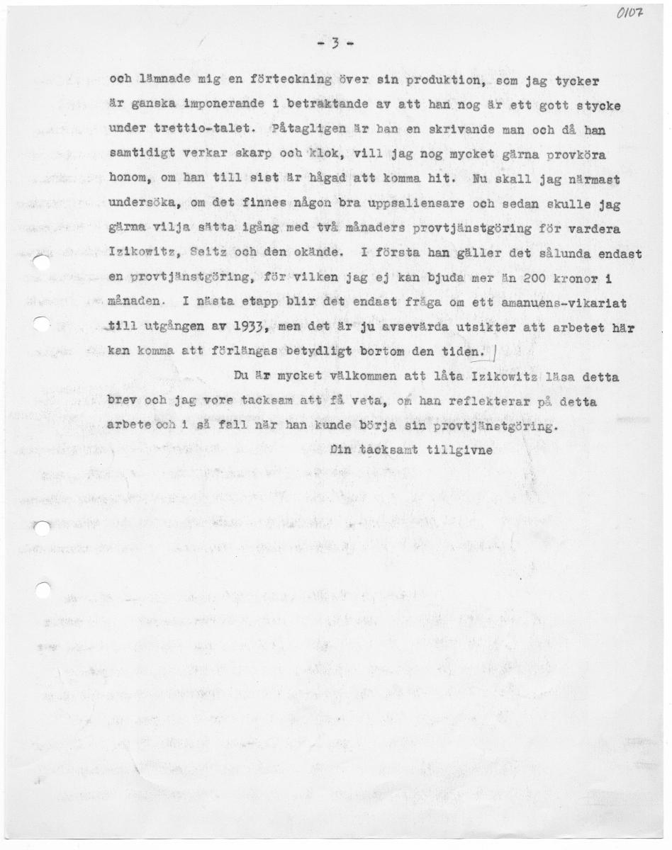 OI0? rr och lämnade mig en förteckning över sin produktion,.som jag tycker är ganska imponerande i beträktande av att han nog är ett gott stycke under trettio-talet. Påtagligen är han en skrivande man och då han samtidigt verkar skarp och klok, vill jag nog mycket gärna provköra honom, om han till sist är hågad att komma hit. Nu skall jag närmast undersöka, om det finnes någon bra uppsallensare och sedan skulle jag gärna vilja sätta igång med två månaders provtjänstgöring för vardera Izikowitz, Seitz och den okände, I första han gäller det sålunda endast en provtjänstgöring, för vilken jeg ej kan bjuda mer än 200 kronor i "månaden. I nästa etapp blir det endast fråga om ett amanuéns-vikariat Sill utgången av 1933, men det är ju avsevärda utsikter att arbetet här ken komma att förlängas betydligt bortom den tiden. | | Du är mycket välkommen att låta Izikowltza läga detta brev och jag vore tacksam att få veta, om han reflekterar på detta arbete och i så fell när han kunde börja sin provtjänstgöring. Din tacksamt tillgivne |