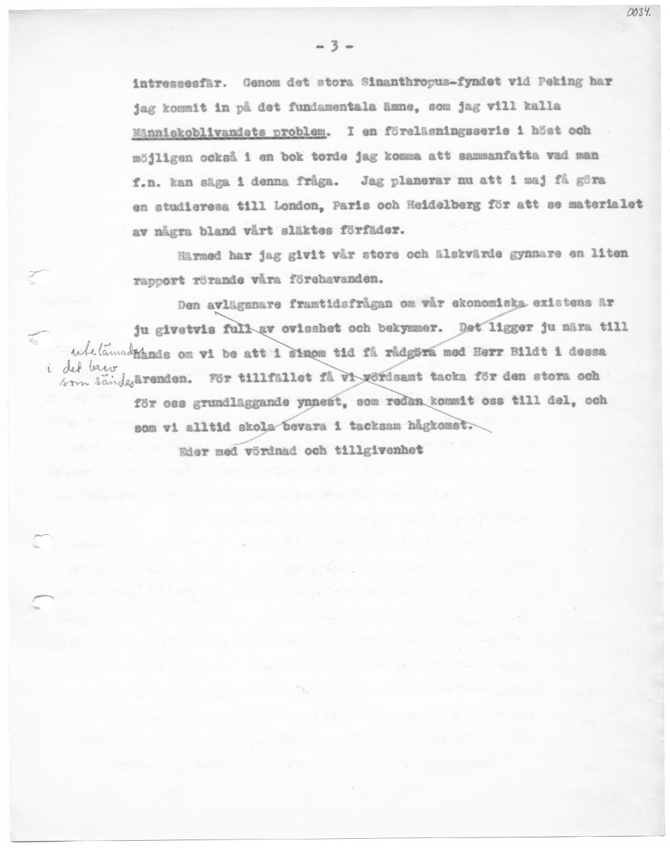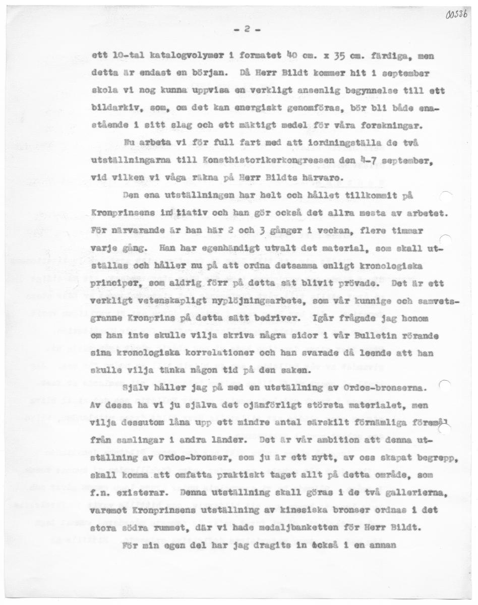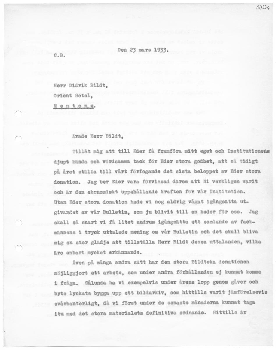 0384 Den 23 mars 1933. C.B, Herr Didrik Bildt, Orient Hotel, Mentons Ärade Herr Bildt, Tillåt mig att till Eder få framföra mitt eget och Institutionens djupt kända och vördsamma tack för Eder stora godhet, att så tidigt på året ställa tilll vårt förfogande det sista beloppet av Eder stora donation. Jag ber Eder vara förvissad därom att Hi verkligen varit och är den ekonomiskt uppehållande kraften för vår Institution. Utan Eder stora donation hade vi nog aldrig vågat igångsätta ut. givsndet av vår Bulletin, som ju blivit till en heder för oss. Jag skall så snart vi få litet andrum igångsätta ett samlande av fack. männens 1 tryck uttalade mening om vår Bulletin och det skall bliva mig en stor glädje att tillstilla Herr Bildt dessa uttalanden, vilka äre enbart mycket erkinnande. Även på många andra sätt har den stora Bildtska donationen möjliggjort ett arbete, som under andra förhållanden ej kunnat komma 1 fråga. Sålunda ha vi exempelvis under årens lopp genom gåvor och byte lyckats bygga upp ett bildarkiv, som hittills varit jämförelsevis svårhanterligt, då vi föret under de senaste månaderna kunnat taga itu med det stora materialets definitiva ordnande. Hittills är (0s3b ett 10-tal katalogvolymer 1 formatet 30 om. x 35 om. färdiga, men detta är endast en början. Då Herr BLlåt kommer hit i september ekola vi nog kunna uppvisa en verkligt ansenlig begynnelse till ett bildarkiv, som, om det kan anergiskt genomföras, bör bli både ans. etående 1 sitt slag och ett miktigt medel för våra forskningar. ma arbeta vi för full fart med att iordningställa de två utställningarna tilll Zonsthlietorikerkongressen den 3.7 septenbear, vid vilken vi våga räkna på Harr Bildts härvaro. Den ena utställningen har helt och hållet tillkomsit på > Kronprinsens ini tiativ och han gör också det allra mesta av arbetet. För närvarande är han här 2 och 3 gånger 1 veckan, flere timar varje gång. Han har egenhändigt utvalt det material, som skall ut. stillas och håller nu på att ordna detesnsa enligt kronologiska principer, som aldrig förr på detta sät blivit prövade. Det är ett verkligt vetenskapligt nyplöjningsarbete, som vår kunnige och samvets- granne Kronprins på detta sätt bedriver. Igår frågade jag honom om han inte skulle vilja skriva några sidor I vår Bulletin rörande sina kronologiska korrelstioner och han svarade då leende att han skulle vilja tänka någon tid på den saken. Själv håller jag på med en utställning av Ordos-bronserna. ” Av dessa ha vi ju själva det ojunförligt störeta materialet, men vilja dessutom låna upp ett mindre antal särekilt förnämliga förena från samlingar I andra länder. Det är vår ambition att denna ut. i ställning av Ordos-bronser, som ju är ott nytt, av oss skapat begrepp, skall komma att omfatta praktiskt taget allt på detta område, som f.n, existerar. Denma utstillning skall göras i de två gallerierna, varenot Kronprinsens utställning av kinesiska bronser orinas 1 det stora södra runnet, där vi hade medaljbanketten för Herr Bildt. För min ogen del har jag dragits in tokså I en annan i dek bur Arn Sovndsärenden. För tillfallet få Vb. WIN a. intressesfär. Genom det stora Sinanthropus-fyndet vid Peking har jag kommit in på det fundamentala äane, som jag vill kalla sk indets rnroblenm. I en förelisningsserie 1 höst och möjligen Ne 1 sn bok torde jag komma att sommanfatta vad man f.n. kan säga i denna fråga. Jag planerar nu att i maj få göra an etudieresa till London, Paris och Heldölberg för att se materialet av några bland vårt släktes förfäder. Härmed har jag givit vår store och älskvärde gynnare en liten rapport rörande våra förehavanden. Den avlägsnare framtidsfrågan om vår skonomiska existens är ju givetvis fu ovisshet och bekymmer. Det ligger ju nära till som tid få sen Herr Bildt i dessa sfåsamt tacka för gen stora och för oss grundluggan redan kommit oss till del, och som vi alltid okola Eovara 1 tacksam hågkomst:. Rdsrt med I vördnad och tillgivenhet