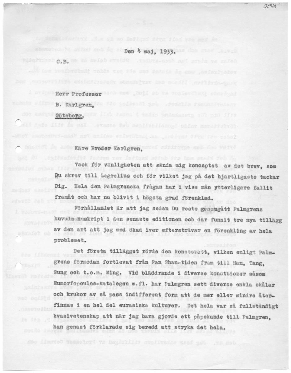 a: an a RA - fd ” — EE RER ”B39la SS Den 3 maj, 1933. OB. Herr Professor B. EFarlgren, Käre Broder Karlgren, Tack för vänligheten att sända mig konceptet av det brev, som Ru skrov till Lagrelius och för viltet jag på det hjärtligaste tackar Dig, Esla den Pelmgrenska frågan har i viss mån ytterligare fallit framåt och har nu blivit i högsta grad förenklad. Förhållandet är att jag sedan Du reste genohgått Palmgrens huvudmanuskript i åen senaste editionen och där funnit tre nya tillägg av den art att jag med ökad iver eftersträvar en förenkling av hela problemet, : Det första tillägget rörde den konstskatt, vilken enligt Palm. grens förmodan fortlevat från Pan Shan-tiden fram till Han, Tang, Sung och t.o.m. Ming. Vid blaäddrande i diverse konstbäcker såsom FEumerfopoulos-katalogen m.fl. har Palmgren sett diverse enkla skålar och krukor av så pass indifferent form att de mer eller mindre åter. finnas i en hel del eurasiska kulturer. Det hela var så fullständigt kvasivetenskap att när jag bara gjorde ett påpekande till Palmgren, han genast förklarade sig beredd att stryka det hela,