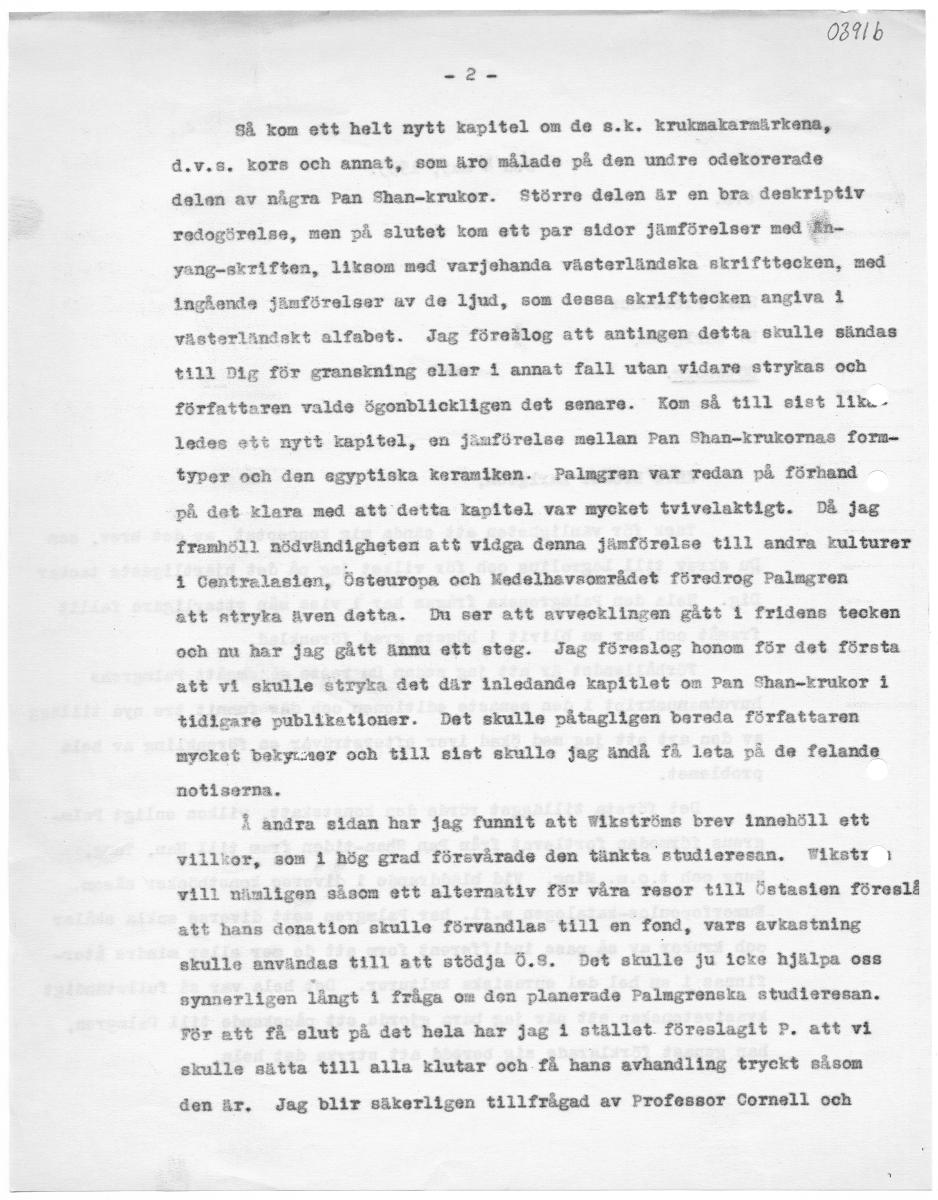 Så kom ett helt nytt kapitel om de s.k. krukmakarmärkena, d.v.s. kors och annat, som äro målade på den undre odekorerade delen av några Pan Shan-krukor. Större delen är en bra deskriptiv SR redogörelse, men på slutet kom ett par sidor jämförelser med "Er yang-skriften, liksom med varjehanda västerländska skrifttecken, med -: ingående jämförelser av de ljud, som dessa skrifttecken angiva i västerländskt alfabet. Jag föreslog att antingen detta skulle sändas till Mg för granskning eller i annat fall utan vidare strykas och författaren valde ögonblickligen det senare. Kom så till sist lik. - ledes ett nytt kapitel, on jämförelse mellan Pan Shan-krukornas form. typer och den egyptiska keramiken. Palmgren var redan på förhand — på det klara med att detta kapitel var mycket tvivelaktigt. Då jag framhöll nödvändigheten att vidga denna jämförelse tll1l andra kulturer 1 Centrelasien, Östeuropa och Hedelhavsområdet föredrog Palmgrten att stryka även detta. Du ser att avvecklingen gått i fridens tecken och nu har jag gått ännu ett steg. Jag föreslog honom för det första att vi skulle stryka det där inledande kapitlet om Pan Shan-krukor i tidigare publikationer. Det skulle påtagligen bereda författaren mycket bekyrner och till sist skulle jag ändå få leta på de felande notiserna. Å andra sidan har jeg funnit att flikströms brev innehöll ett villkor, som 1 hög grad försvårade den tänkta studieresan. MWikstr Ii vill nämligen såsom ett alternativ för våra resor till Östasten föreslå att hans donation skulle förvandlas till en fond, vars avkastning skulle användas $111l att stödja Ö.9. Det skulle ju icke hjälpa oss synnerligen långt i fråga om don planerade Palmgrenska studieresan. för att få slut på det hela har jag i stället föreslagit P. att vi skulle sätta till alla klutar och få hans avhandling tryckt såsom den är, Jag blir säkerligen tillfrågad av Professor Cornell och