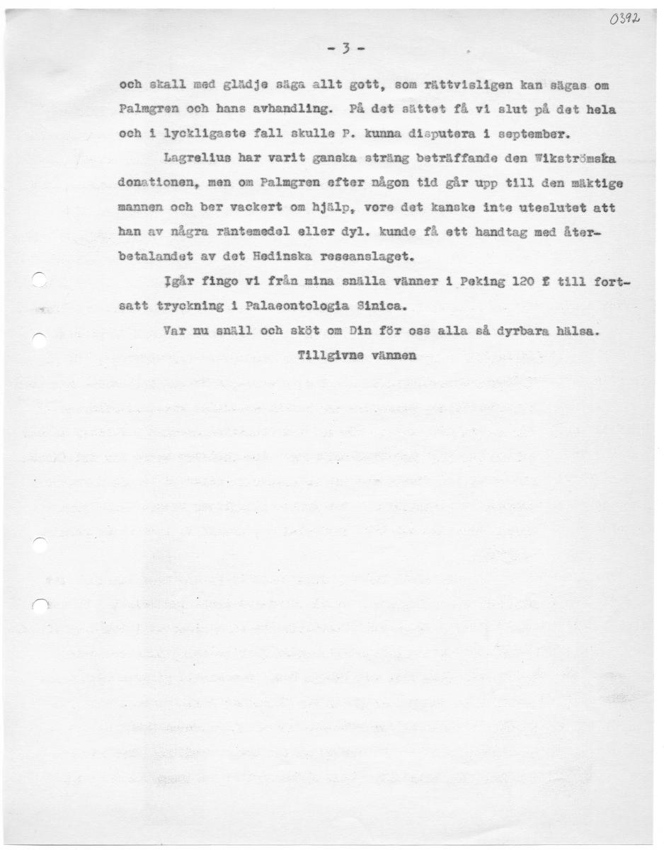 ÖL SE och skall med glädje säga allt gott, som rtättvisligen kan sägas om Palmgren och hans avhandling. FPå det sättet få vi slut på det hela och i lyckligaste fall skulle P. kunna disputera 1 september. Lagrelius har varit ganska sträng beträffande den fikströmska donationen, men om Palmgren efter någon tid går upp till den mäktige mannen och ber vackert om hjälp, vore det kanske inte uteslutet att han av några räntemedel eller dyl. kunde få ett handtag med åter. betalandiet av det Hedinska reseanslaget. Igår fingo vi från mina snälla vämner 1 Peking 120 £ till fort- satt tryckning i Palaeontologia Sinica. Var nu snäll och sköt om Din för oss alla så dyrbara hälsa. Tillgivne vännen