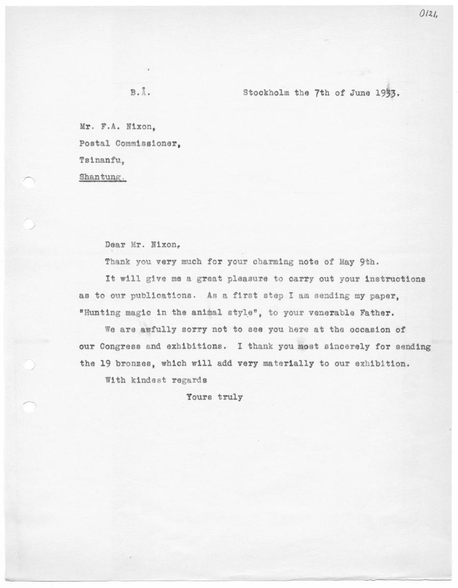 Ölal, B.1Å. Stockholm the 7th of June 1933, Mr. FA: Nixon, Postal Commissioner, Tsinanfu, Shantung. Dear Mr. Nixon, Thank you very much for your charming note of May 9Yth. It will give me a great pleasure to carry out your instructions as to our publications. As a first step I am sending my paper, "Hunting magic in the anihal style", to your venerable Father, We are awfully sorry not to see you here at the oeccasion of our Congress and exhibitions, I thank you most sincerely for sending the 19 bronzes, which will add very materlally to our exhibition. With kindest regards Yours truly