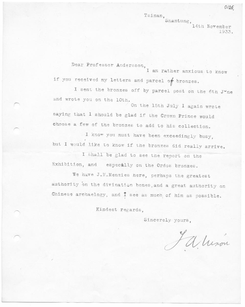0126, Tsinan, / Shantung, l4th November KO55: Dear Professor Andersson, ' I am rather anxious to know if vou received my letters and parcel of bronzes. I sent the bronzes off by parcel post on the 6th JYne and wrote you on the lOth. ; On the 1l5th July I again wrote EN tnat I should be glad if ihe Crown Prince would choose a few of the bronzes to add to his töllectidn. I know you must have been FÖRENAR EE busy, but I vana like to know if the bronzes did really arrive, I shall be glad to see the report on the Exhibition, and especålly on the Ordos bronzes. We have J.M.Menzies here, perhaps the greatest authority on the divination bones ,and a great authority on Chinese archaelogy, and Tf see as much of him as possible. Kindest regards, Hincerely yours,