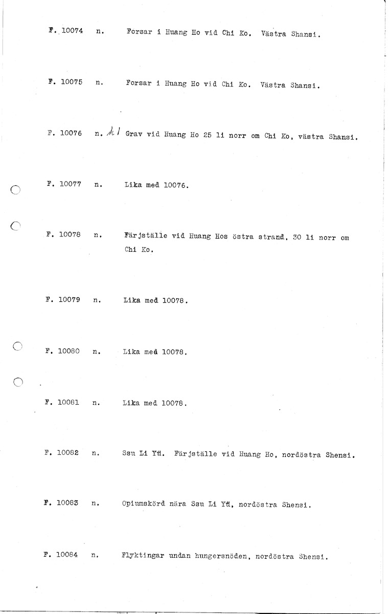 • Sida ur katalog för fotografier av Johan Gunnar Andersson, F.10000-10576, 11000-12233, 50000-50044.