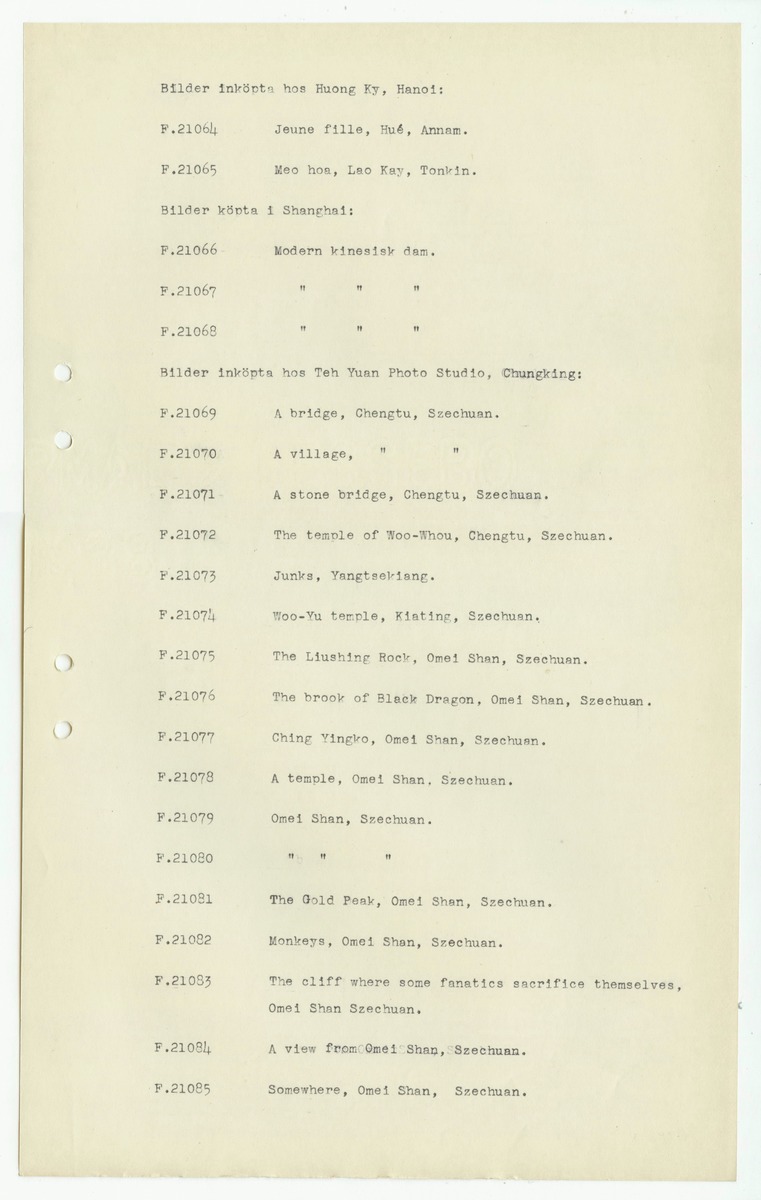 • Sida ur katalog för fotografier, "Presentfotografier" från Johan Gunnar Andersson, F.0001-1999, 20000-.
