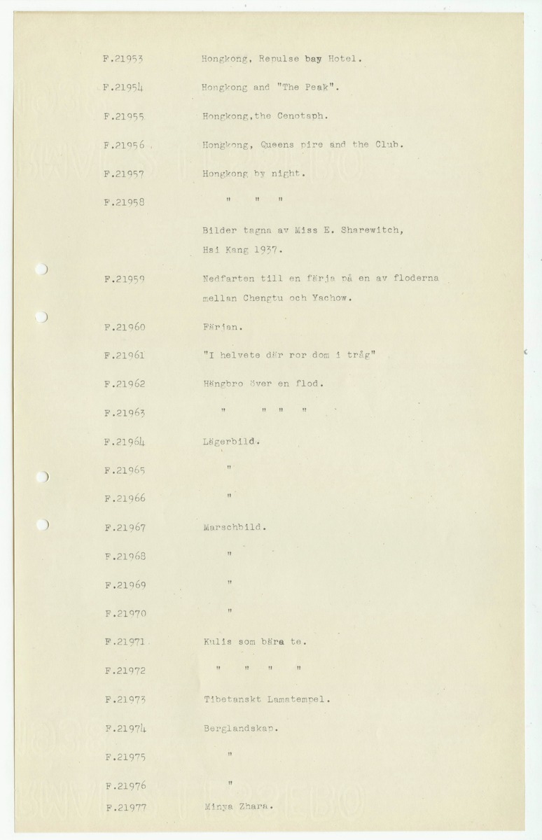 • Sida ur katalog för fotografier, "Presentfotografier" från Johan Gunnar Andersson, F.0001-1999, 20000-.