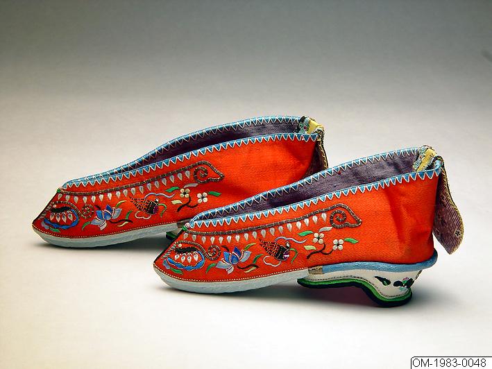 Sko för bundna fötter av broderat siden. Hör ihop med ID-nr 103854. Från textilmagasinet, skåpet märkt “Skor”. Längd 12,5 cm.