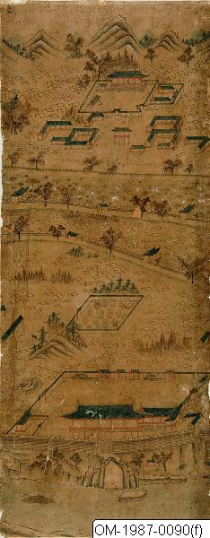 • Karta över stadslandskap. Nio skärmmålningar (ursprungligen tio- nr. 2 fattas) monterade på brunt papper. Stiliserad vy över stad bland bergen.