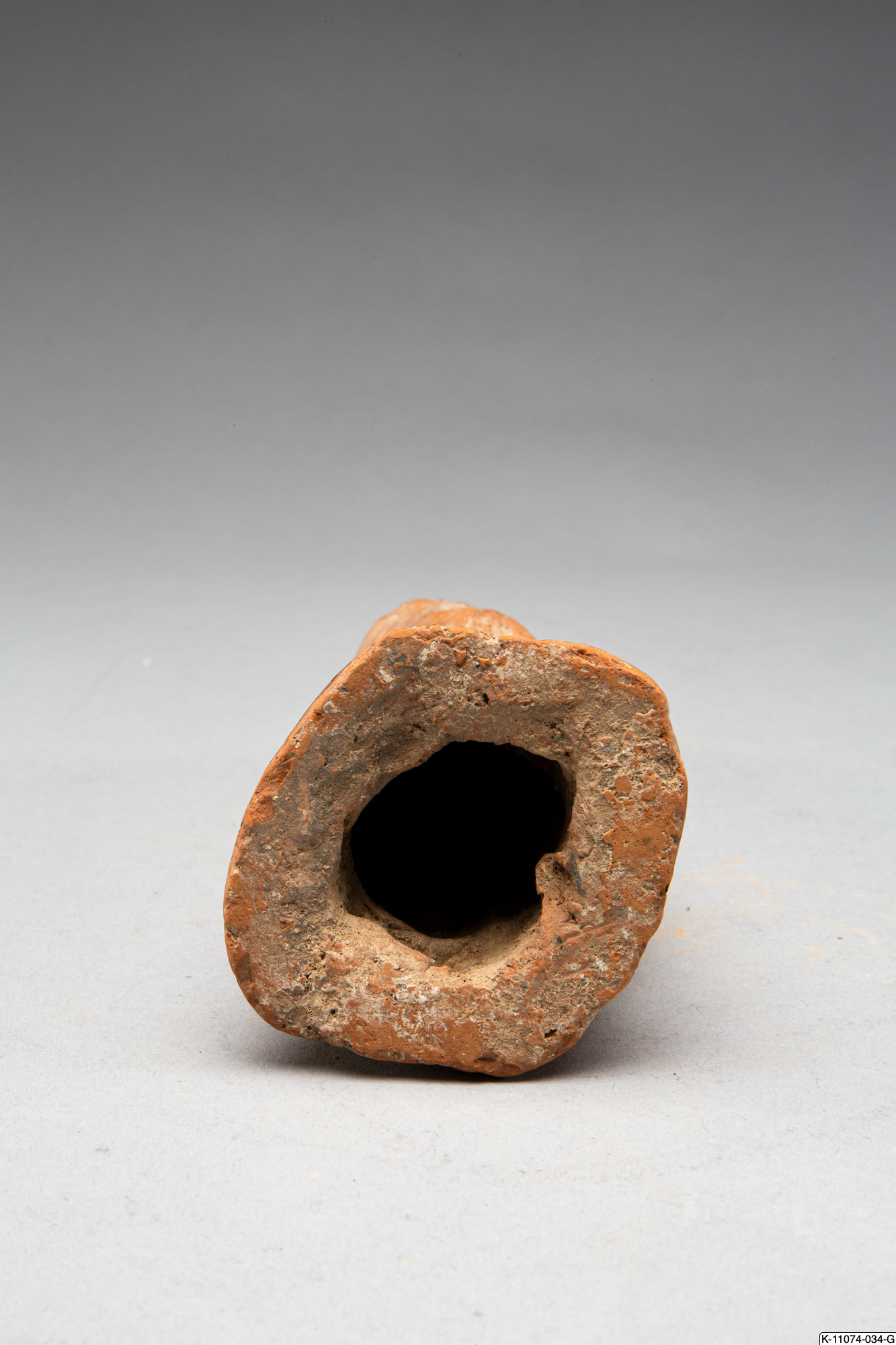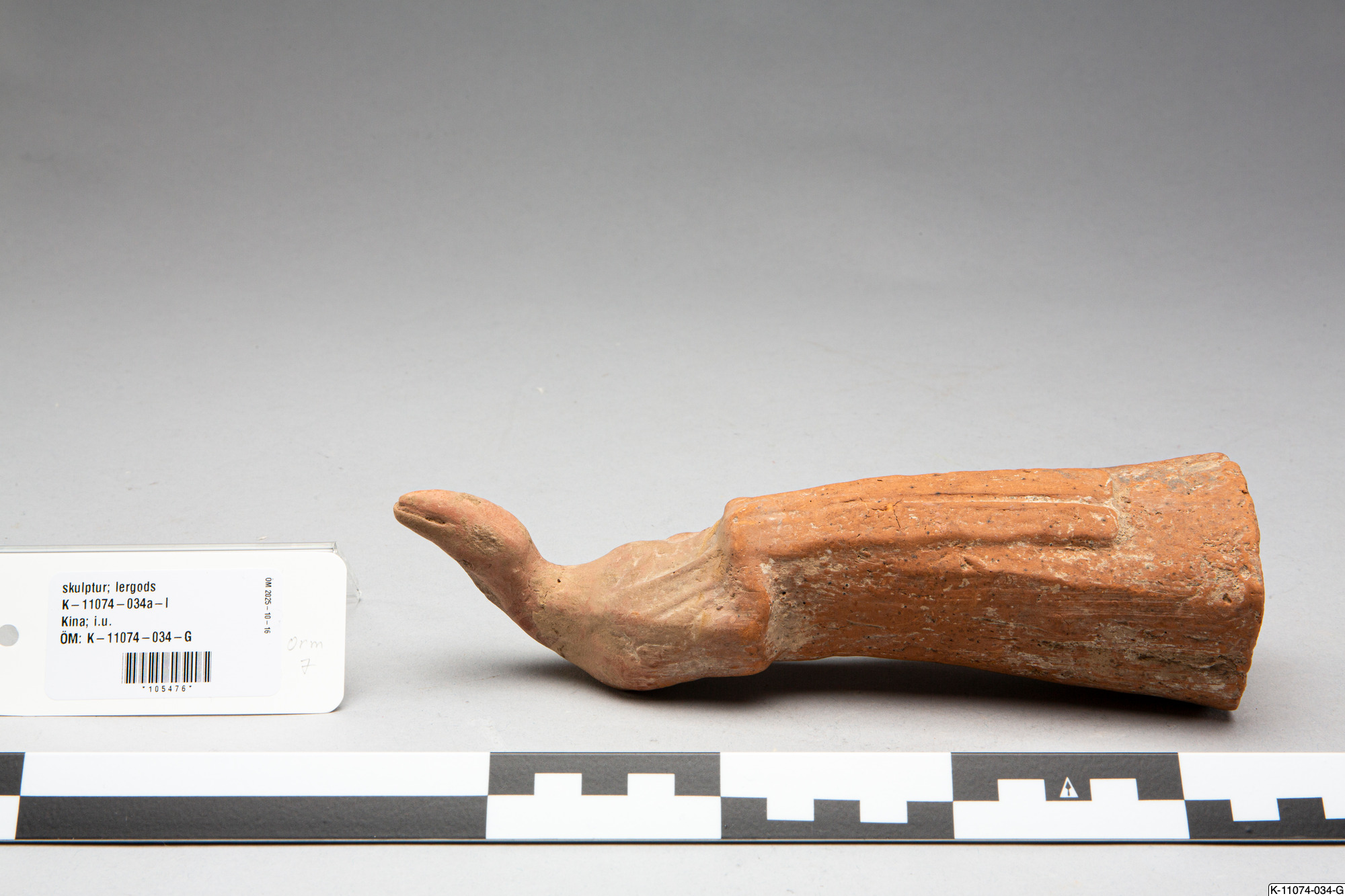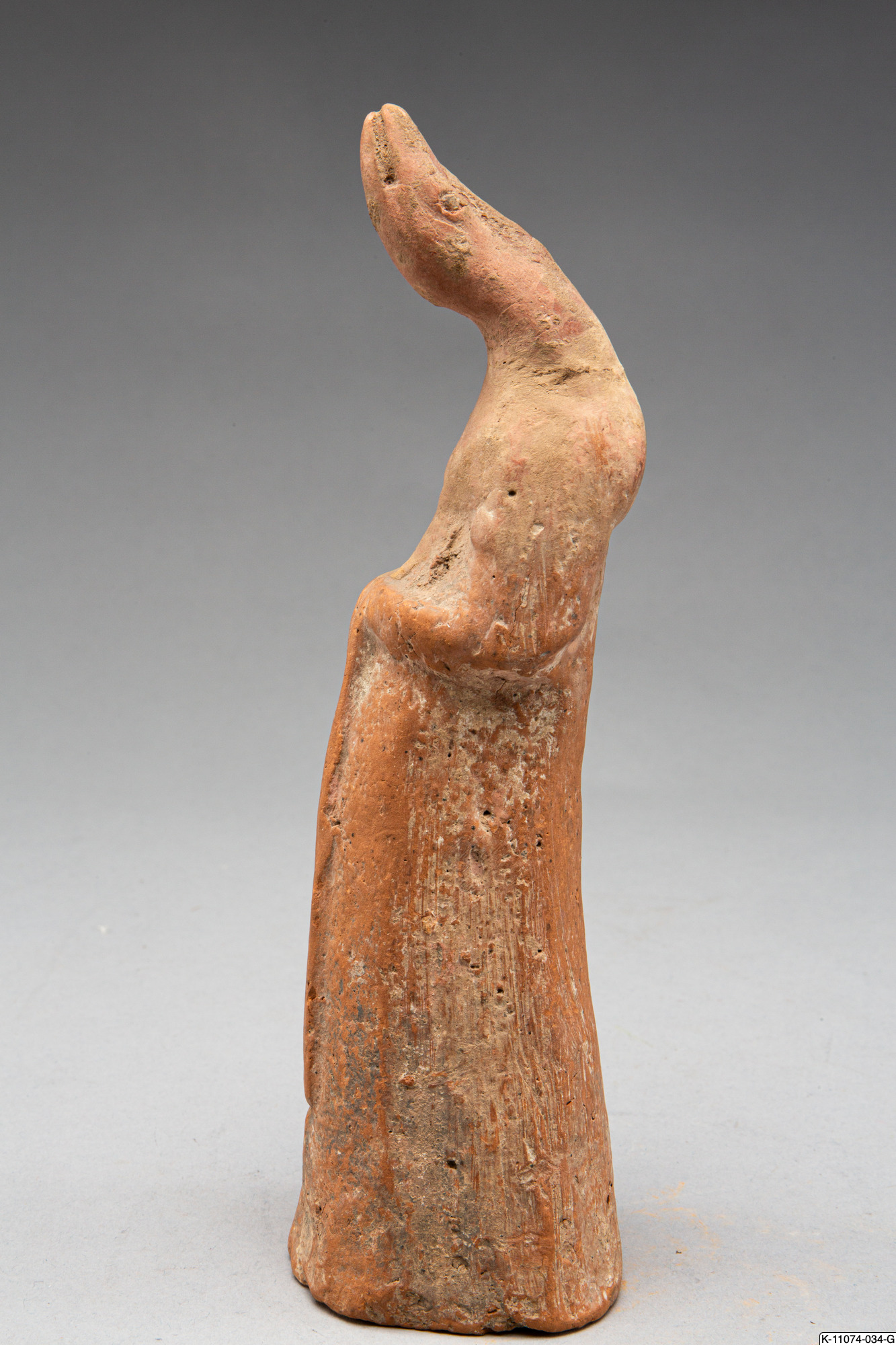 • Ingår i en grupp om tolv stående figurer föreställande zodiakens tolv djur. Rödaktigt lergods. (Märkning K-11074-034a-l.) Från Tang-Ming, röda montern.