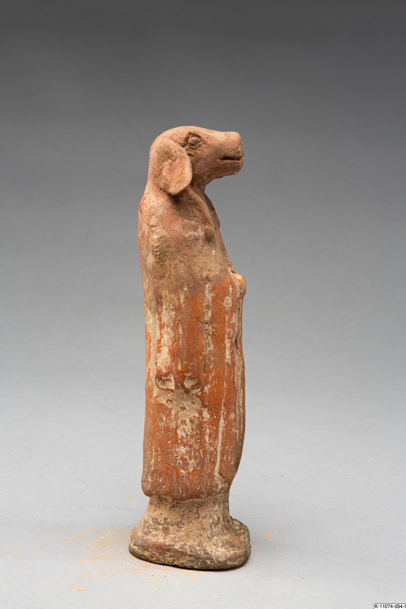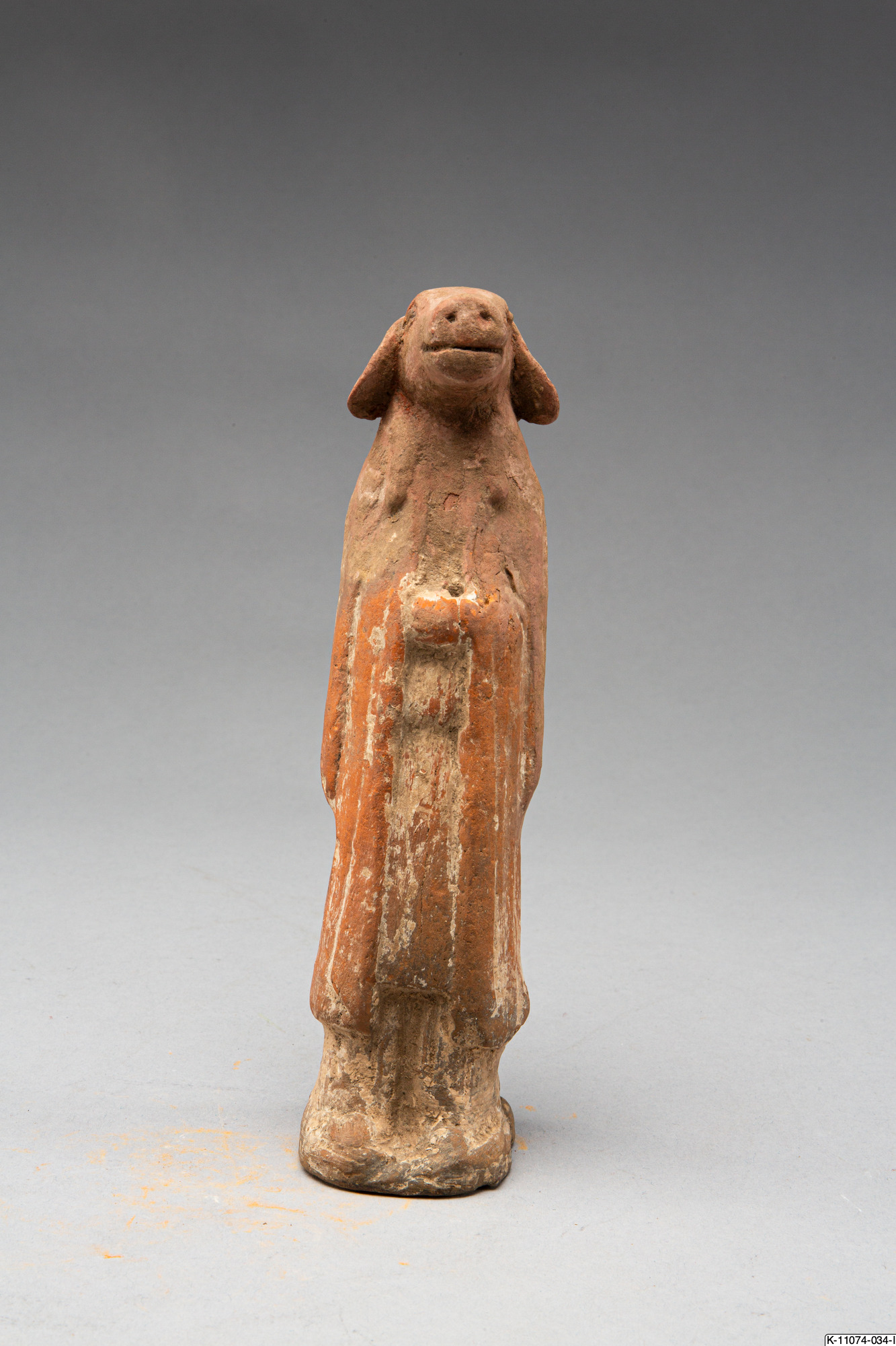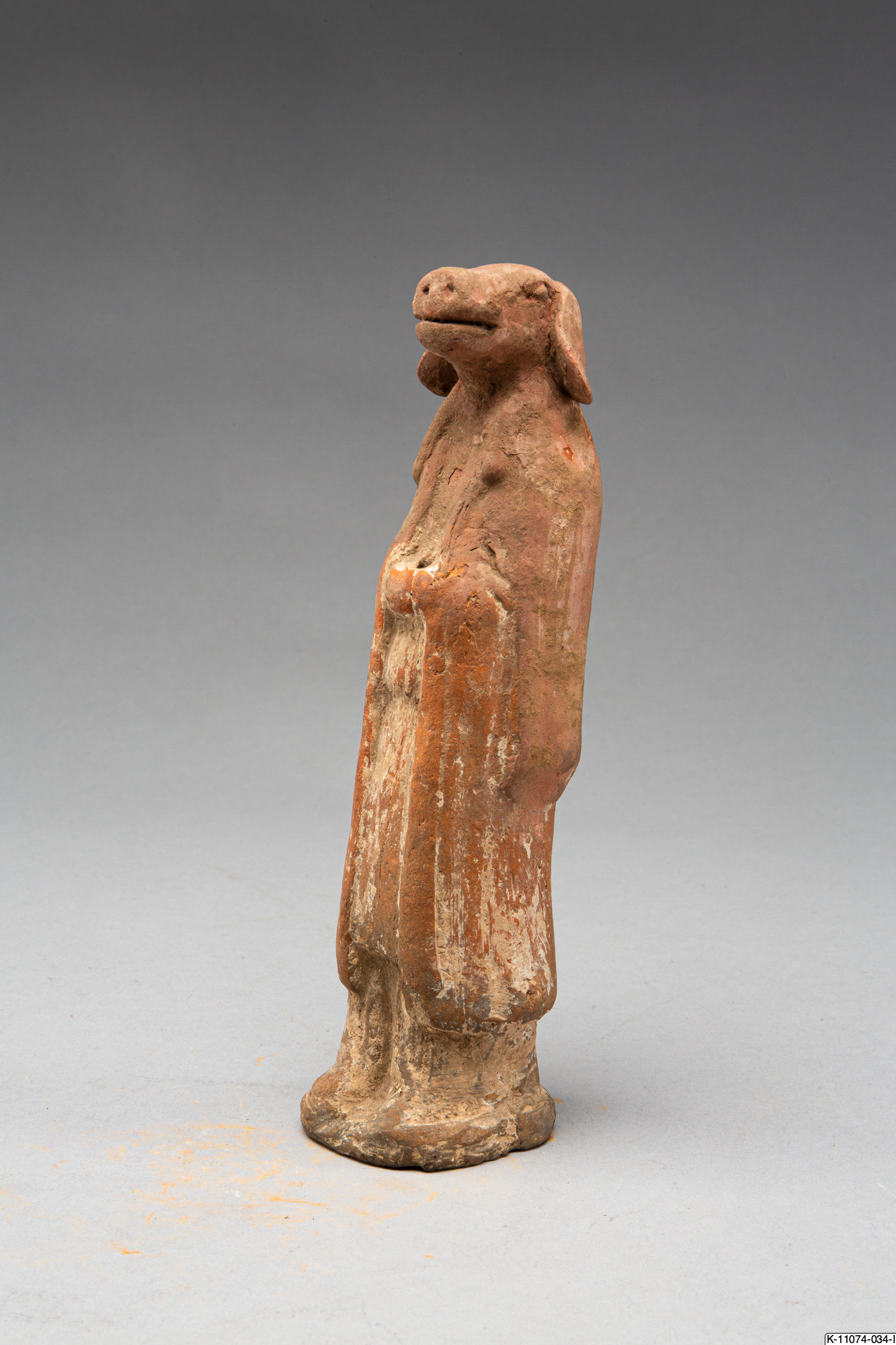 • Ingår i en grupp om tolv stående figurer föreställande zodiakens tolv djur. Rödaktigt lergods. (Märkning K-11074-034a-l.) Från Tang-Ming, röda montern.
