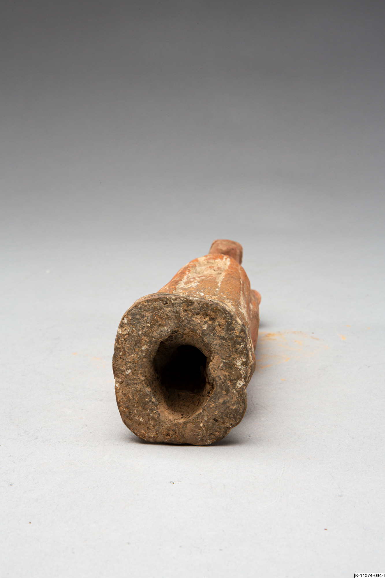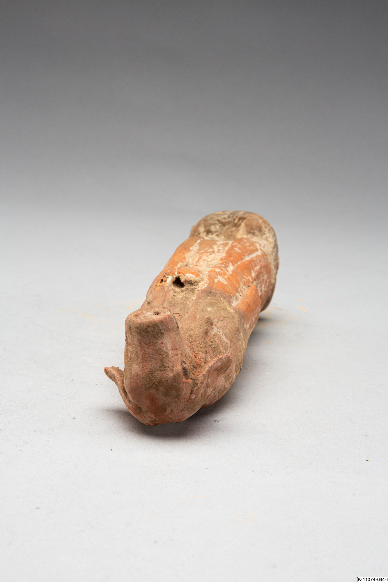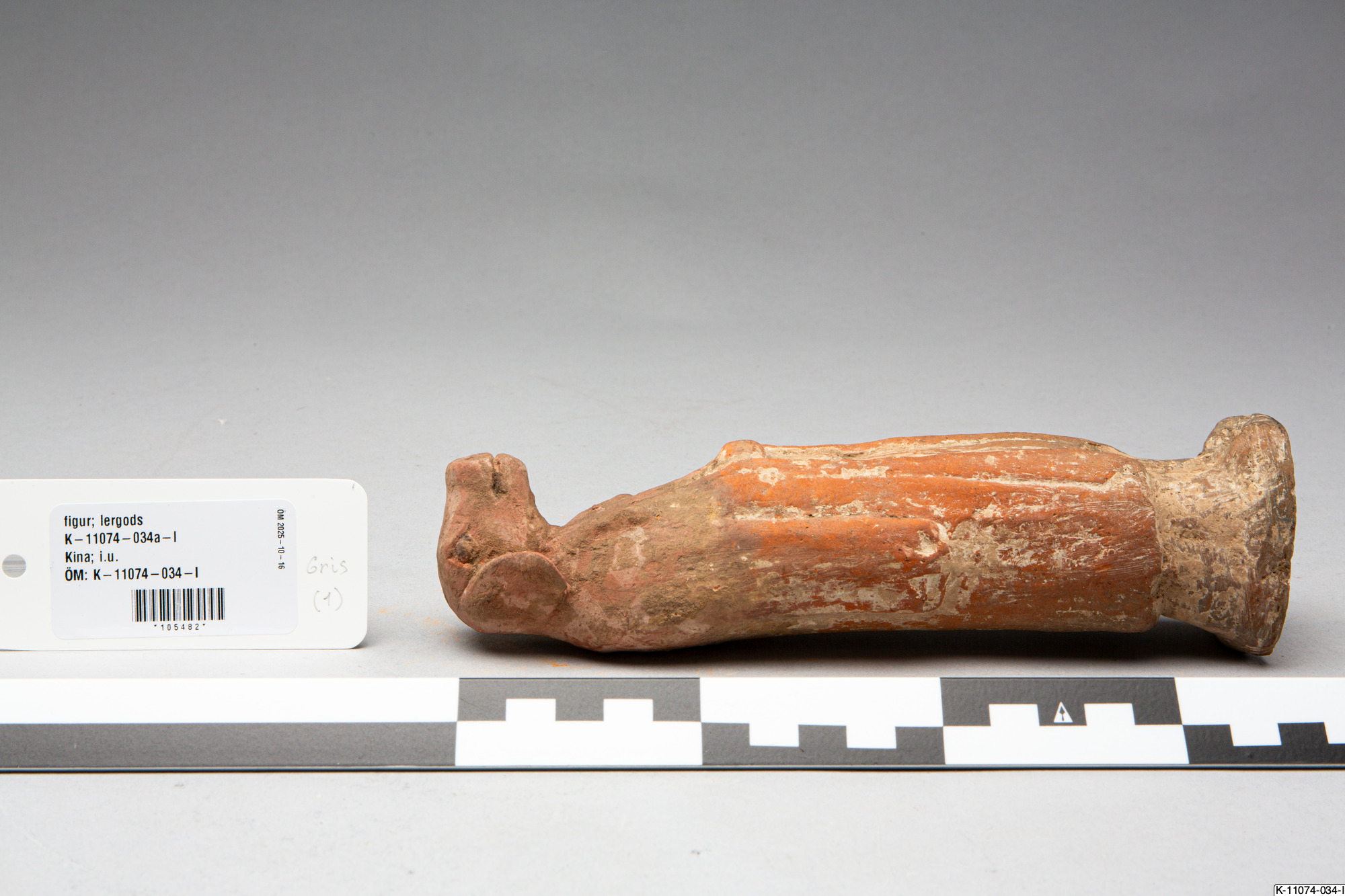 • Ingår i en grupp om tolv stående figurer föreställande zodiakens tolv djur. Rödaktigt lergods. (Märkning K-11074-034a-l.) Från Tang-Ming, röda montern.