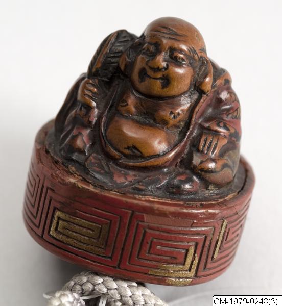Netsuke av lackerat trä i form av sittande Hotei.