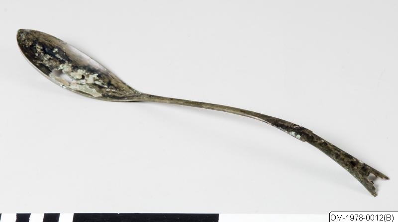 This spoon has a wide, oval bowl with a faintly pointed tip. The delicate handle describes a relatively flat curve and is rectangular with rounded upper corners. The handle flattens out into a swallow...