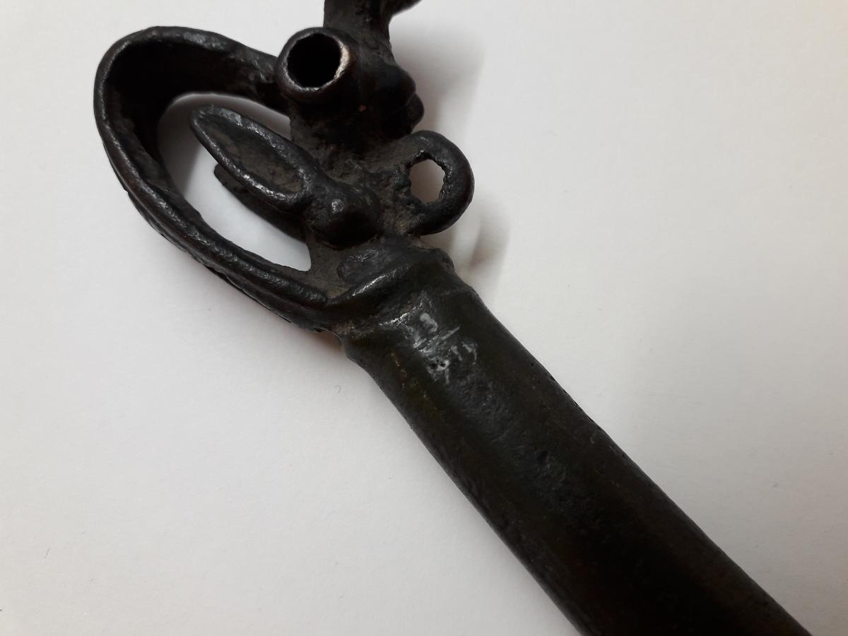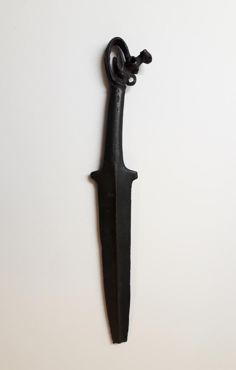 • Dolk av brons. Det runda, smala skaftet slutande i en ögla som dekorerats med ett djur. Han-dynastin?