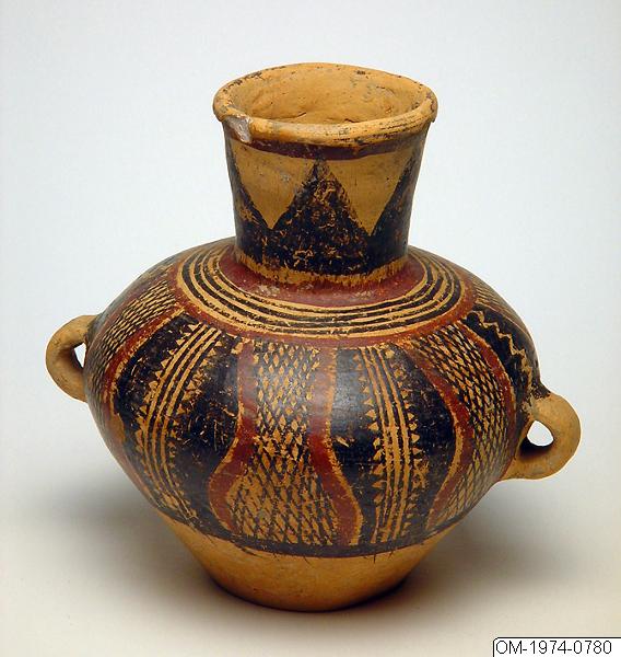 Kruka av målad keramik, från Kina. Krukan har mönster målade i svart och violett. En skärva har slagits ur kanten. Enligt katalogkort: Kruka med röd och svart dekor. Material: Lergods Tillverkningsort: Banshan area, Gansu.