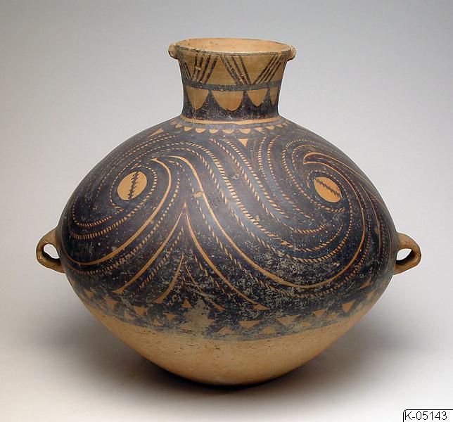 Kruka av målad keramik, från Kina. Krukan är målad med rika mönster i svart och violett. På undersidan finns påskriften “Ning Ting Hsien Pan Shan Bought”. Invid föremålsmärkningen finns också bokstaven “S” inskriven i en fyrkant.