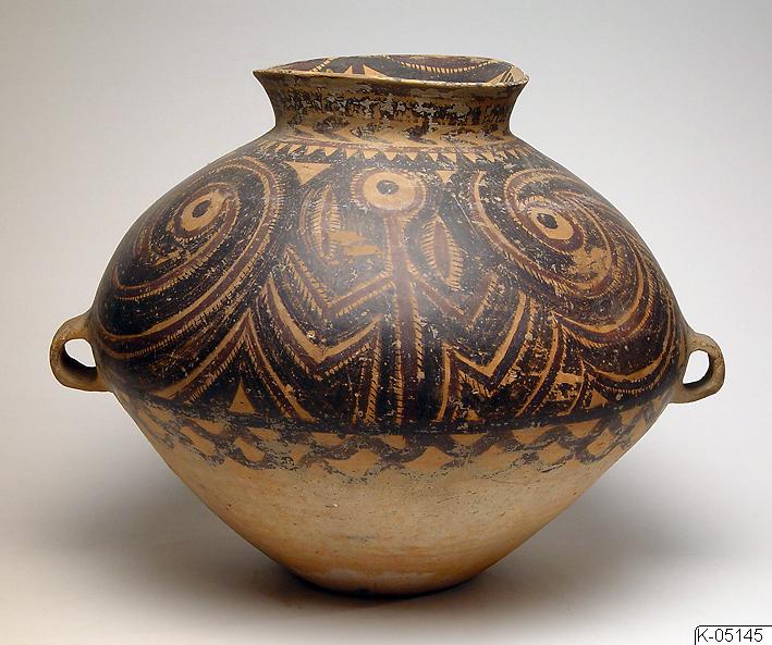 Kruka av målad keramik, från Kina. Krukan har mönster målade i svart och violett. På undersidan finns påskriften “Bought in Lanchow”. Invid föremålsmärkningen finns också bokstaven “S” inskriven i en fyrkant. Kanten något skadad.