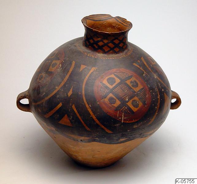 Kruka av målad keramik, från Kina. Krukan är målad med mönster i svart och violett. Nästan nere vid kanten finns påskriften “Bought in Lanchow”. Invid föremålsmärkningen finns också bokstaven “S” inskriven i en fyrkant. Kanten något skadad.