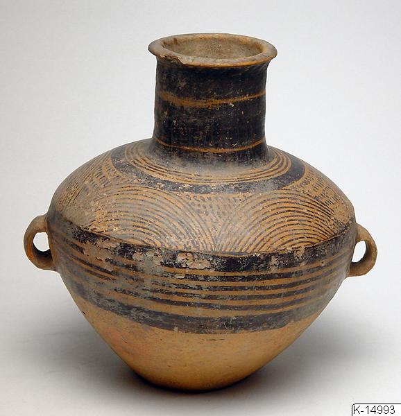 • Kruka av målad keramik, från Kina. Krukan har mönster målade i svart.