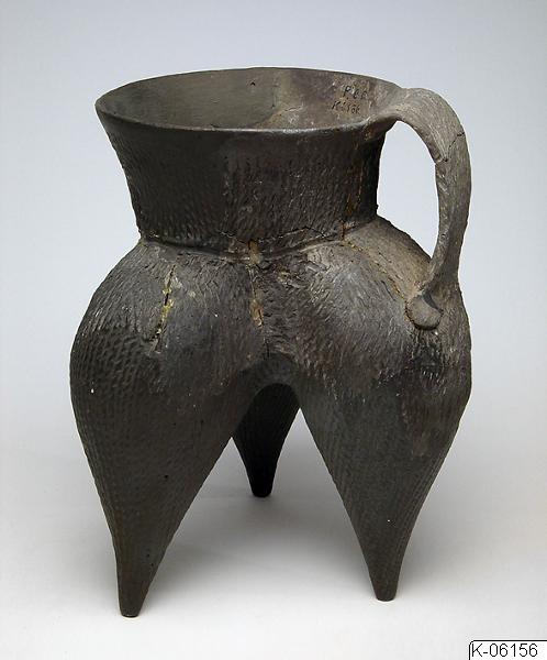 • Tripod av keramik, från Kina. Tripoden har tre juverformade ben samt handtag. Invid föremålsmärkningen finns påskriften “ P.CC.” Kärlet har lagats.