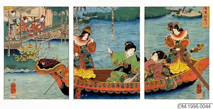 Träsnitt visande båtutflykt i kinesisk stil (Genji-e, "Junkan funa-asobi"; oban-triptyk tillsammans med ÖM 1998: 044 och ÖM 1998: 046) med motiv föreställande en festsmyckad båt med fyra personer och i övre vänsterdel av bilden en paviljong med utsikt över denna scen. Högerbilden (ÖM 1998: 044) visar en person i Heian-inspirerad dräkt och en sittande kvinna, mittenbilden (ÖM 1998: 045) visar en en kvinna i grön dräkt och en person i likartad Heian-inspirerad dräkt. På högerbilden (ÖM 1998: 046) syns en paviljong med två kvinnor och en man, som betraktar båten. Ljusröd titelkartusch på högerbilden (ÖM 1998: 044).Stäng