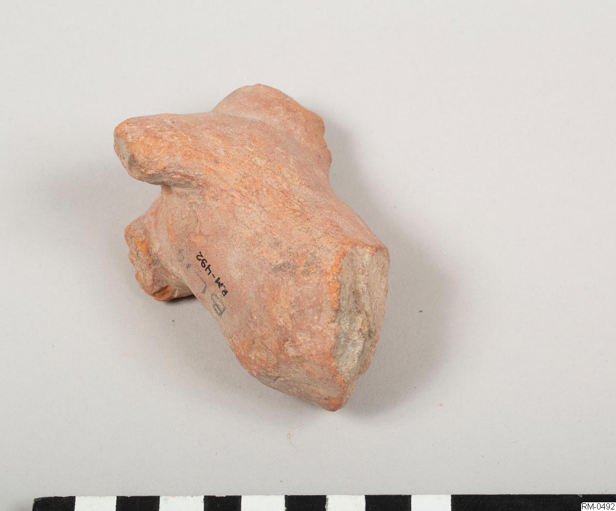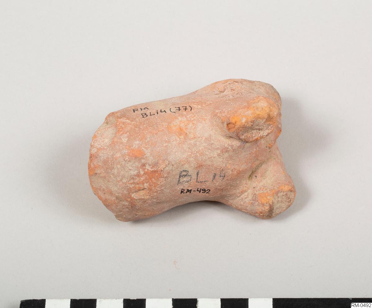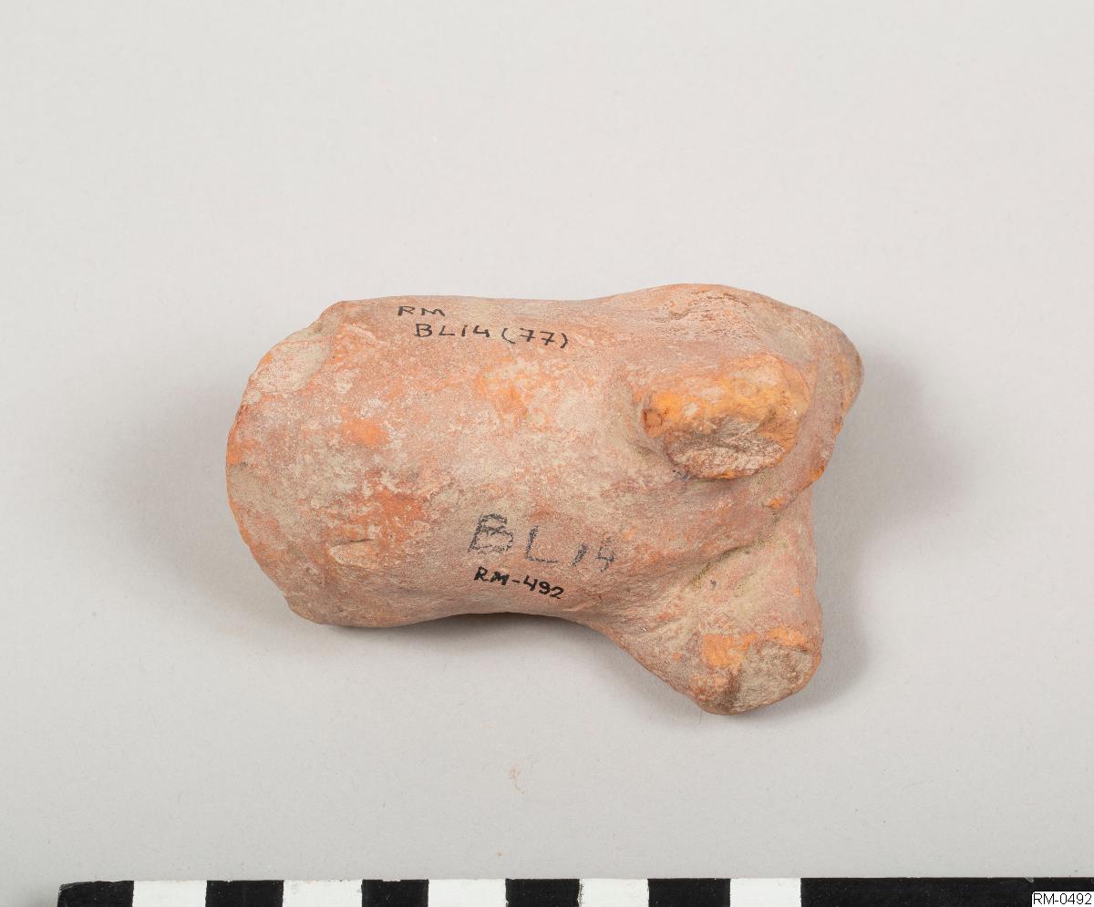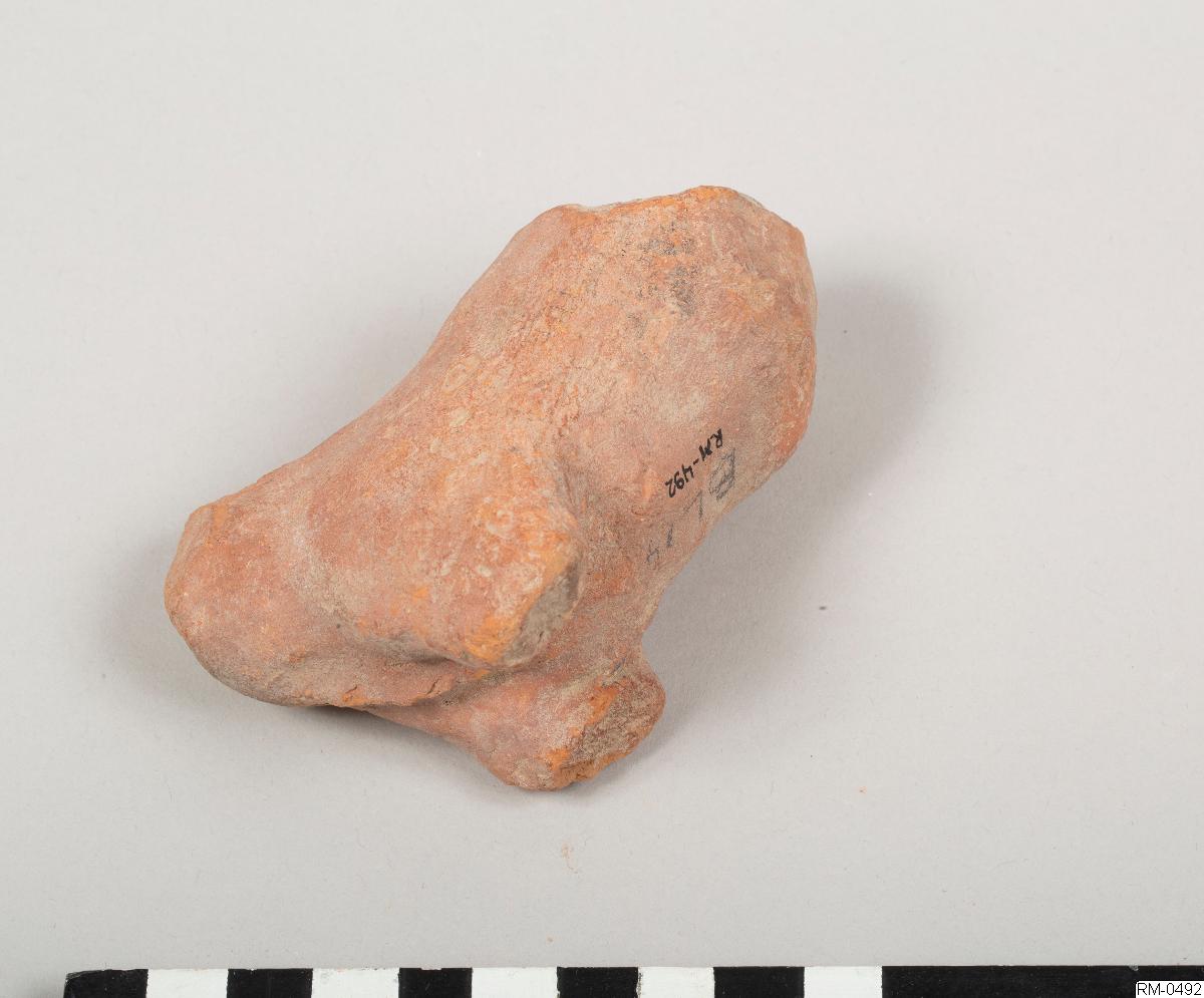 • Skulpterad figur, i rött lergods, föreställande ett fyrbent djur. Möjligen häst eller ko.
