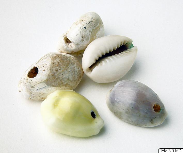 • Fem stycken kaurisnäckor, från Kina. Tre av snäckorna är glansiga, två stycken matta. Alla har hål och kan ha varit uppträdda. På en av de matta snäckorna finns påskriften “P.C.C.”. Föremålet förvarad... Visa hela