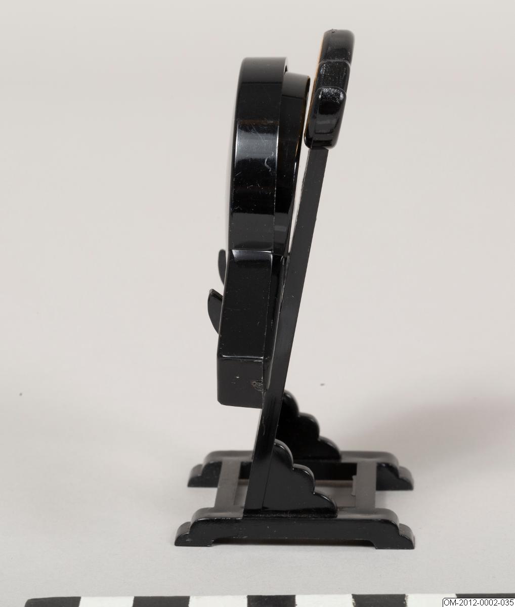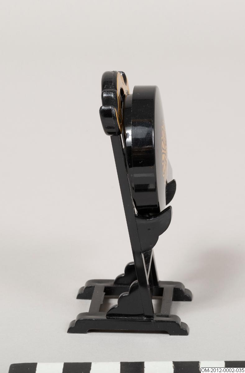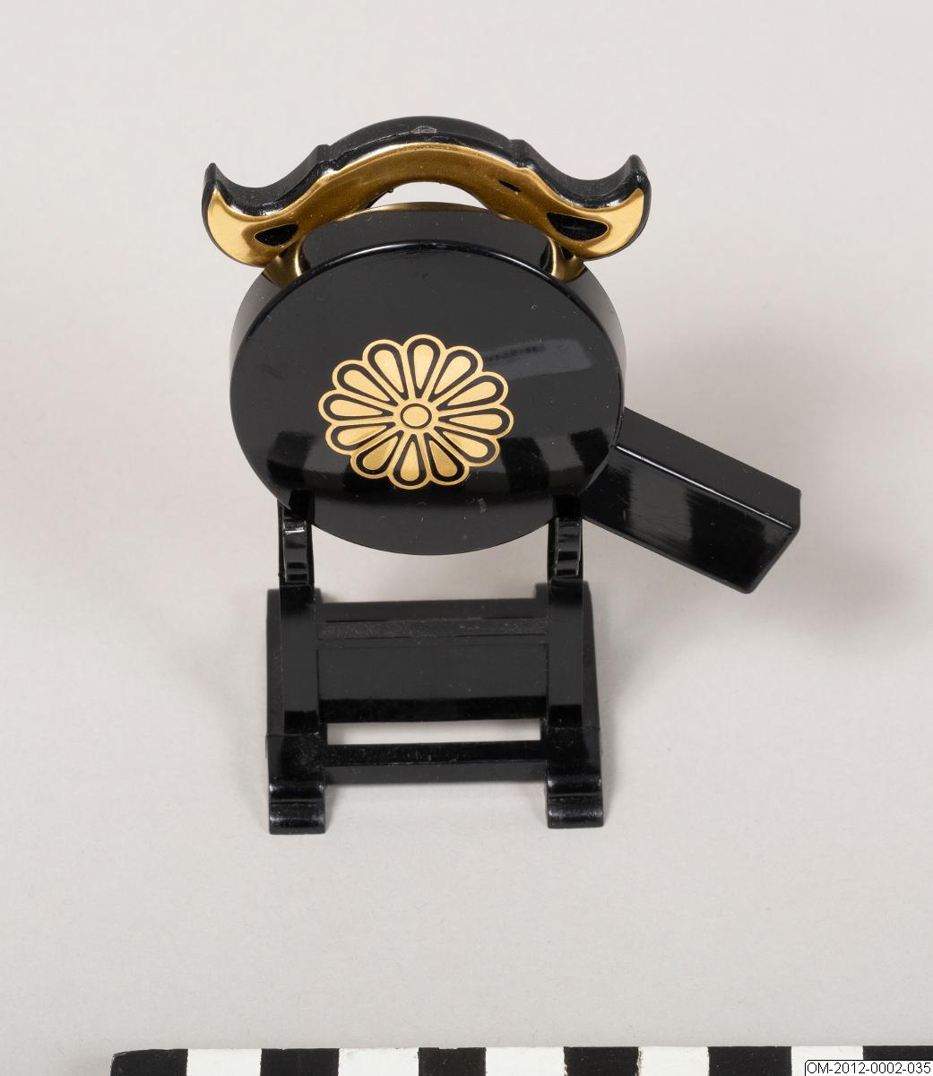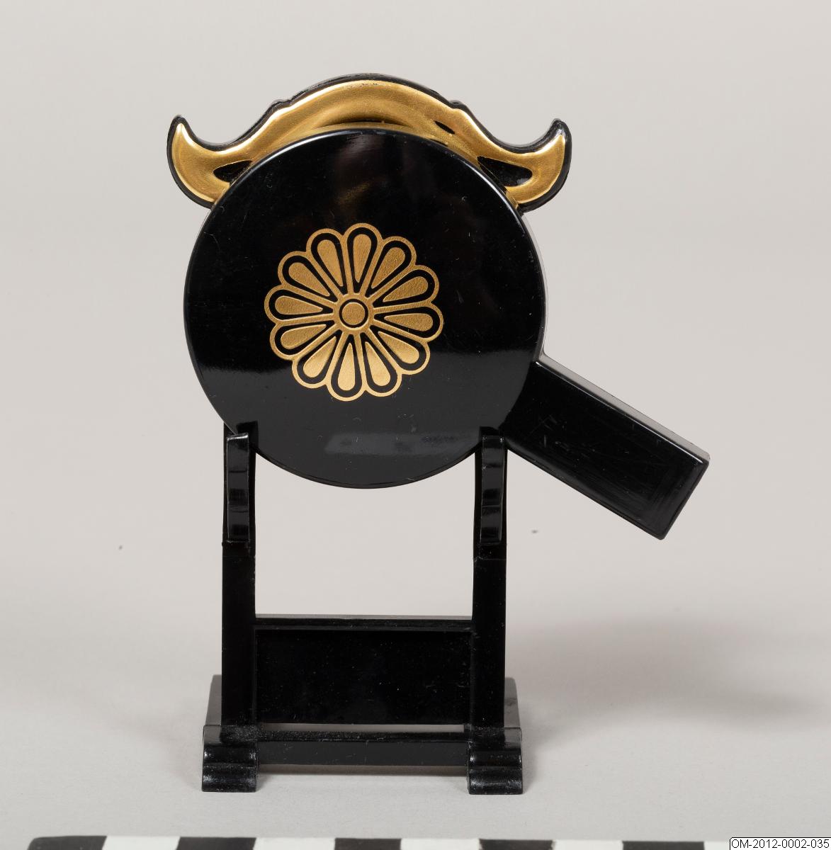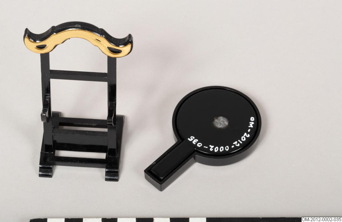Spegel med spegelställ. Del av uppsättning föremål till den japanska dockfestivalen, hina matsuri. Se introducerande beskrivning av dockfestivalen på samlingsnivån för OM-2012. Spegeln är en av de attiraljer som används när dockorna befinner sig hemma i hovet. Huvudpersonerna i uppsättningen av föremål till den japanska dockfestivalen, hina matsuri, är kejsarparet (dairibina) och deras sällskap. Uppsättningen är av den största typen med sju trappsteg och 15 dockor samt attiraljer. /PH juli 2021