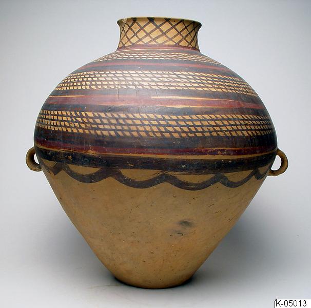 Kruka av målad keramik, från Kina. Krukan är målad med mönster i svart och violett. På undersidan finns påskriften “Bought in Lanchow”. Invid föremålsmärkningen finns också bokstaven “S” inskriven i en fyrkant.