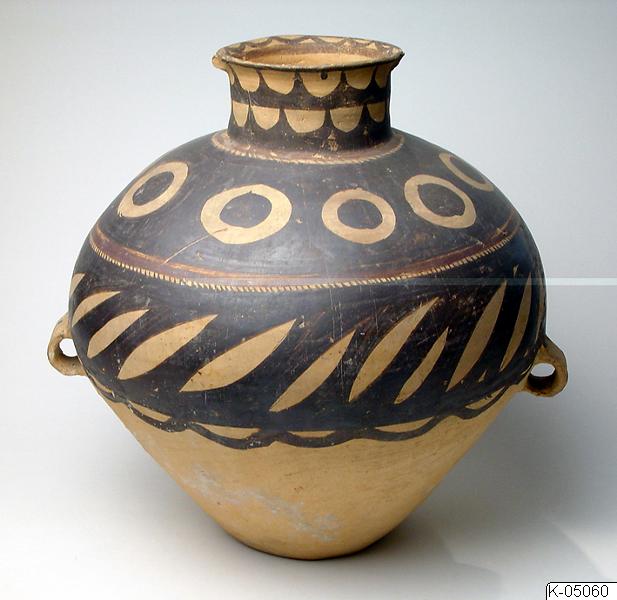 Kruka av målad keramik, från Kina. Krukan är målad med mönster i svart och violett. På undersidan finns påskriften “Ning Ting Hsien Wang Chia Kou Bought”. Invid föremålsmärkningen finns också bokstaven “S” inskriven i en fyrkant. Där finns också en ditsatt etikett med påskriften “Royal Academy of Arts, London. International Exhibition of Chinese Art, 1935-6. Ser. Nos 860. Owner Ostasiatiska Samlingarna Stockholm.”