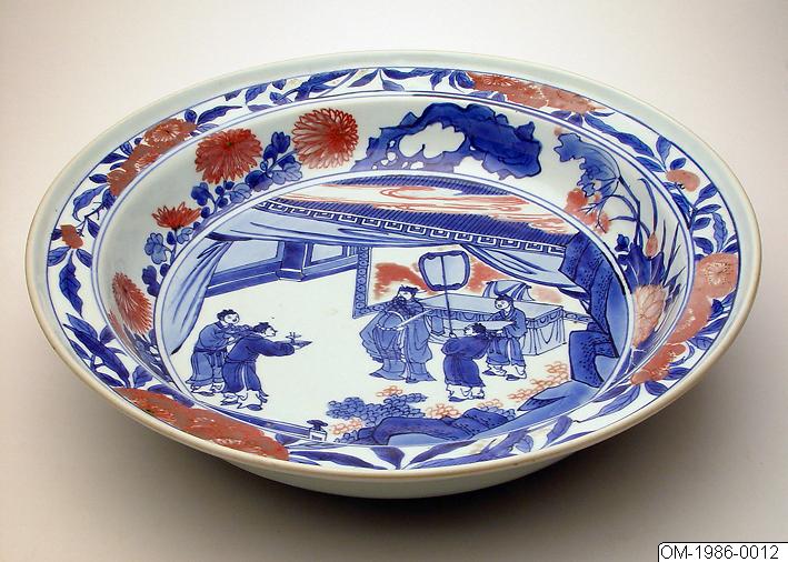 Djupt fat av porslin med rundade sidor och utvikt brätte med uppböjd kant. Dubbel fotring med djup räffla emellan. Dekor i underglasyrblått och kopparrött visande en hall i en trädgård. Hallen möblerad med bord och stol framför en skärm. Framför bordet står en ämbetsman med en "petitionsspira" (gui). Två uppvaktande pojkar står vid hans vänstersida hållande en stor solfjäder och ett fyrkantigt föremål (ett skrin?). Framför ämbetsmannen två uppvaktande pojkar - en räckande fram ett bronskärl av jue-typ, den andra en huvudbonad. Kälningen är dekorerad med trädgårdsklippor, krysantemum och lotus. Brättet har dekor av blommande grenar av persikoträd.