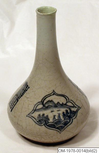 Vas av porslin med dekor i underglasyrblått, märkt “flaska nr 1”. Yi, 1800-tal., Porslinsflaska m hög o smal hals, Korea