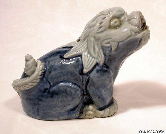 Vattendroppare i porslin i form av det mytologiska djuret "Hae-Tae" . Kroppen bemålad i underglasyrblått, ögon och tunga bemålade med kopparrött, som delvis färgats grönt under bränningen., Vattendroppare i porslin, ett mytologiskt djur, blå på ryggen. Korea, 1700-1800. A. Kalbaks samling (inköp)
