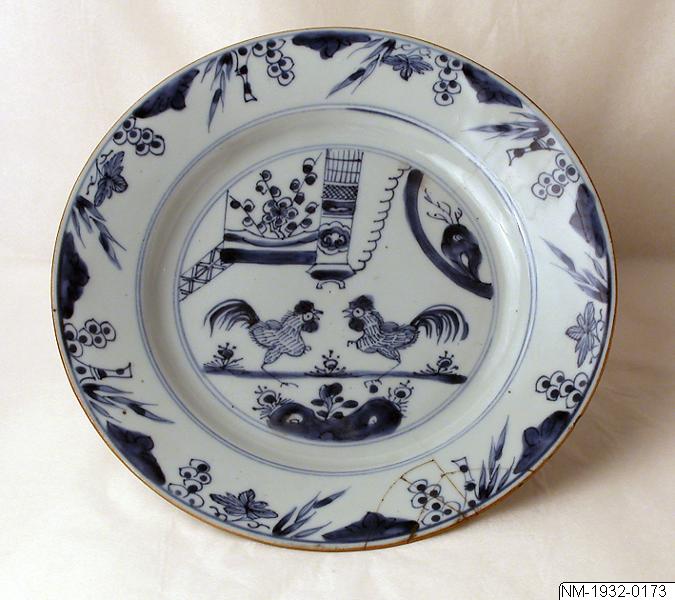 • Tallrik av porslin. Dekorerad i underglasyrblått. På brättet blommor, i mitten två stridandes / fäktandes tuppar, blommor, m.m. Ostindiskt porslin, Kina, 1700-tal. Diameter 23 cm.