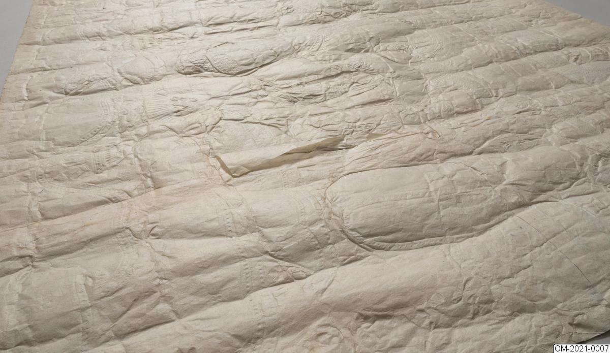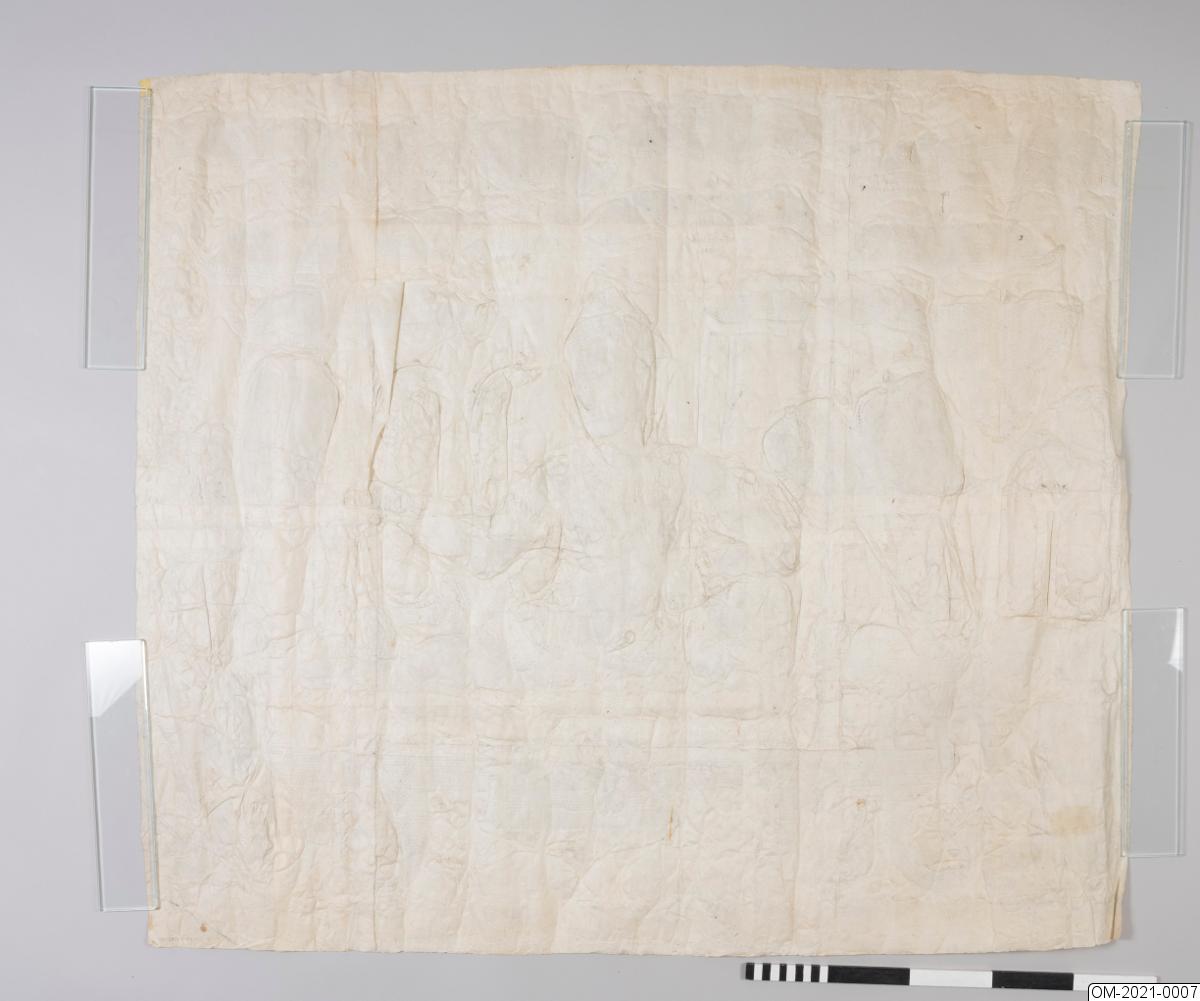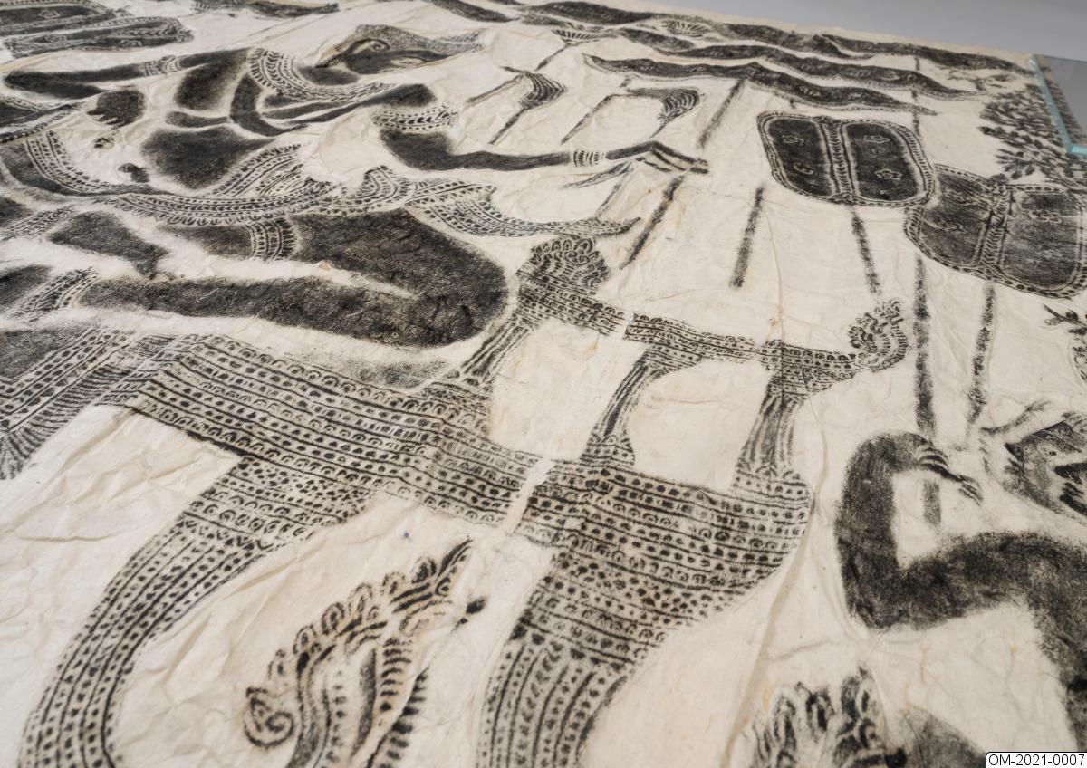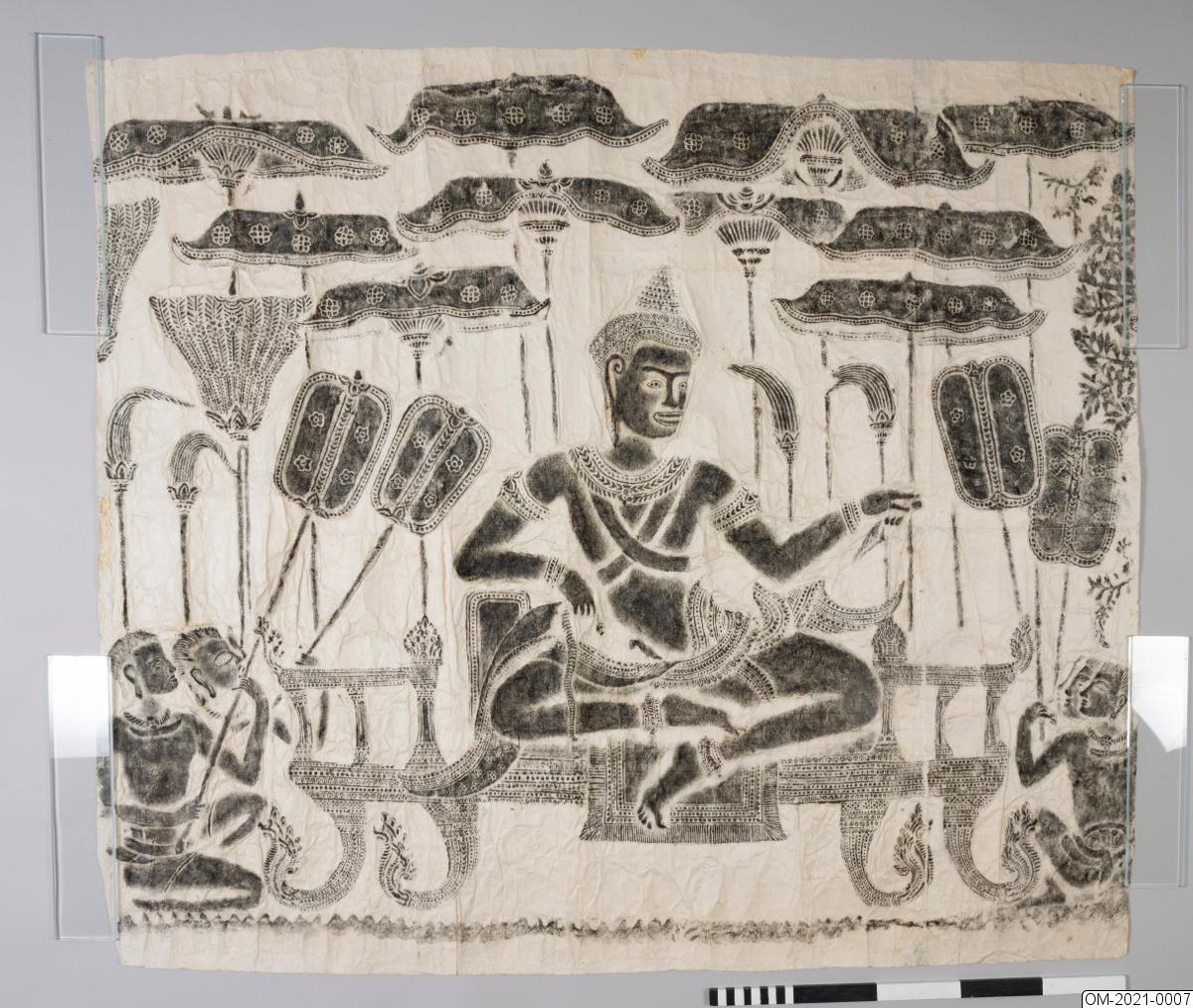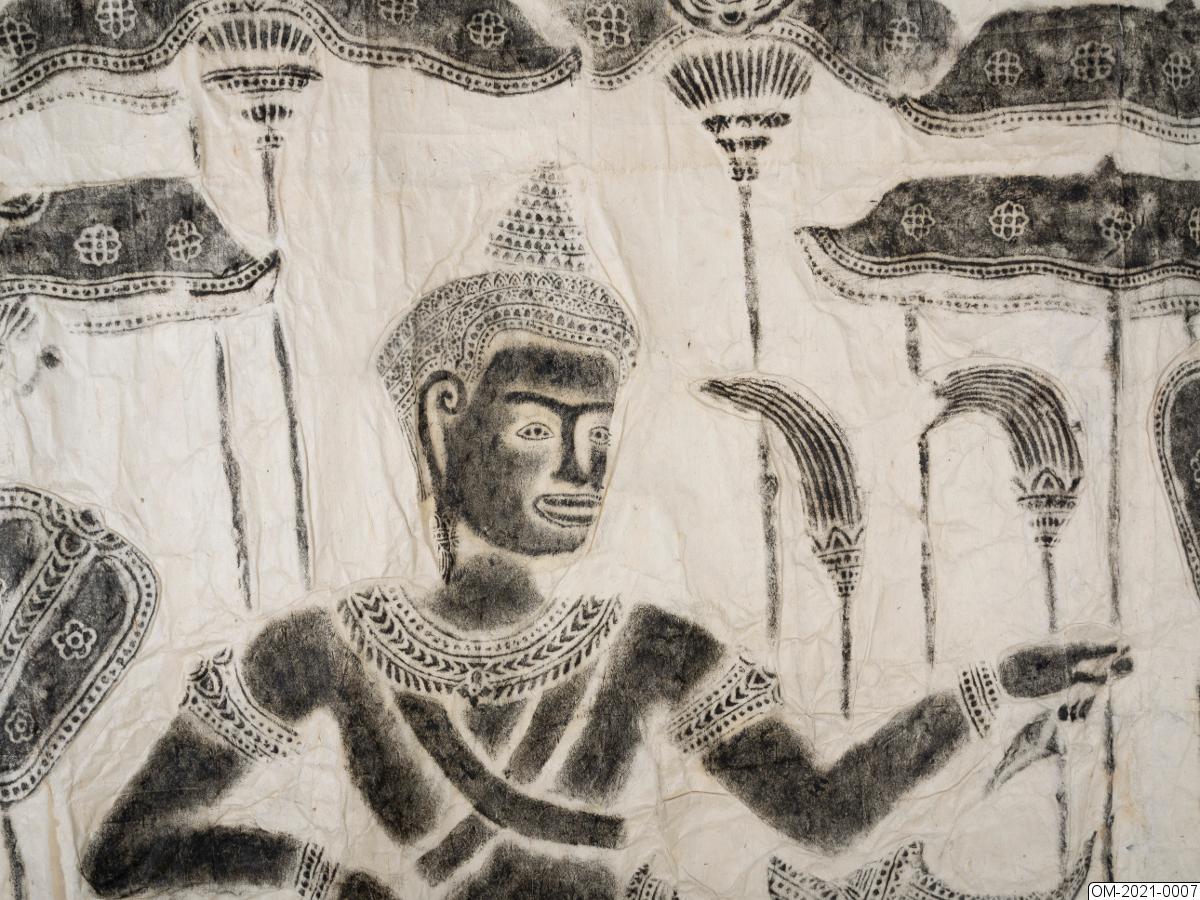 Rubbing from Angkor Wat The rubbing dates to the 1960s. The motif here is King Suryavarman II (ca. 1095 - ca. 1150, regent 1113 - ca. 1150) who sits on a throne on Mount Sivapada (Siva's footprint) to receive the troops' tribute. The king's high position is shown, among other things, by the royal headdress, the throne and the many parasols, fans and fly whisks that surround him and by the fact that he is made larger than the surrounding people. The motif forms the beginning of what has been called "The Historical Procession". The original of the "Historical Procession" is a sandstone relief in the temple of Angkor Wat located in the western part of the southern outer gallery. The total length of the relief panel is almost 100 m. The motif of King Suryavarman II on Mount Sivapada is seen at the start of the procession and he is depicted again in the centre of the procession where each previous and subsequent unit is led by a high representative of provinces in the kingdom. The relief probably dates to the middle of the 12th century some time after the king's death. An inscription with descriptive text runs under the relief. Angkor Wat is the mausoleum of King Suryavarman II and the king initiated the construction during his reign in the first half of the 12th century. The temple was dedicated to the god Vishnu, a deity the king was considered to be a manifestation of and to have joined with at his death and was therefore also a temple for the worship of the king. In the inscription, the king is named Paramavisnuloka (He who reached the kingdom of the Supreme Vishnu). The rubbing corresponds with photographic depictions of the relief in Angkor Wat, with King Suryavarman II in this scene, but some details below and behind the throne are missing in the rubbing.