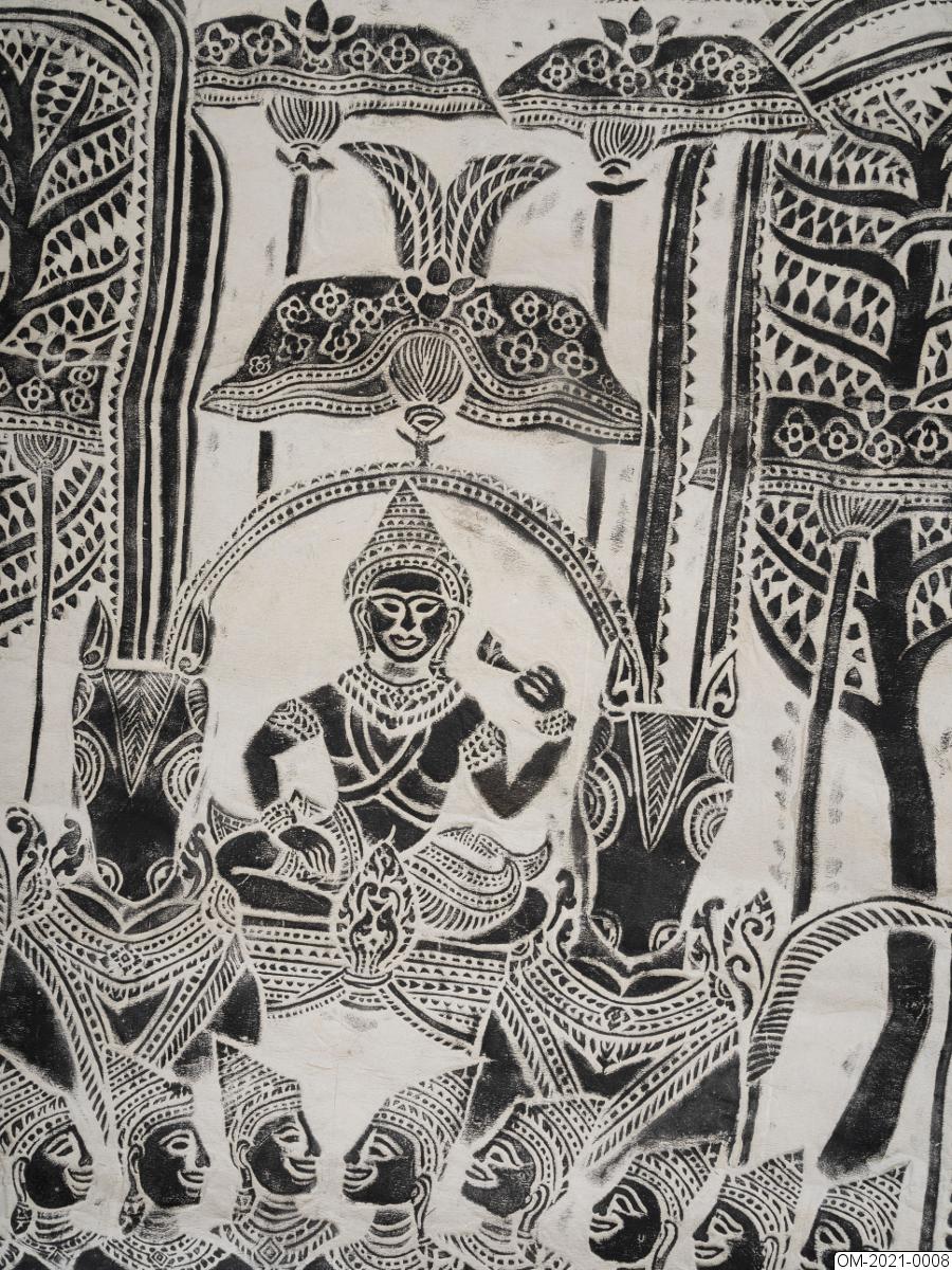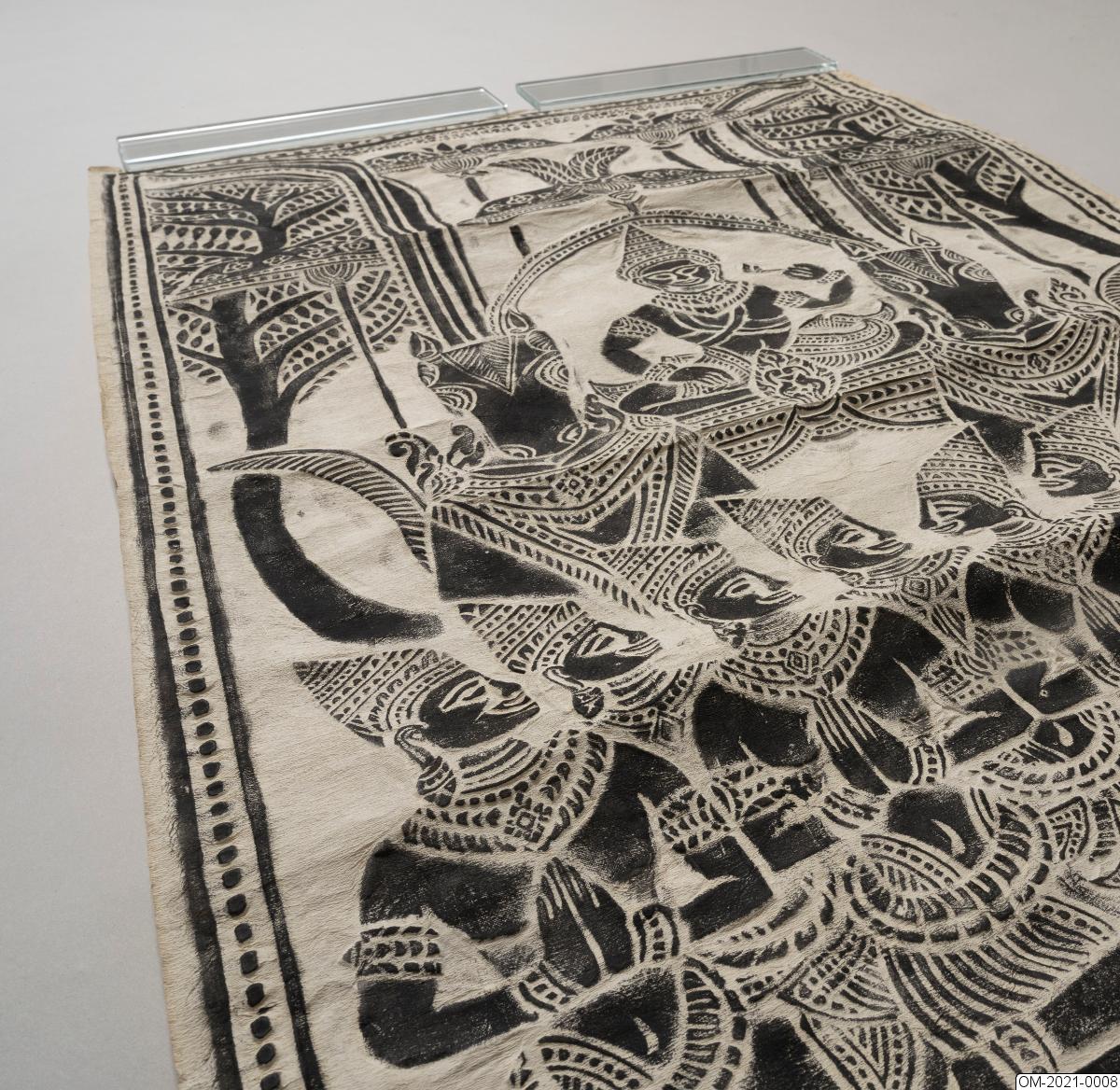 Rubbing from Angkor Wat The rubbing dates to the 1960s. The motif here is the Moon (Soma) drawn in a chariot of two horses reproduced frontally. The original is a sandstone relief in the Angkor Wat temple, located in the eastern part of the northwest gable pavilion. Over this motif, the Sun (Surya) is also depicted in a chariot drawn by two horses. Angkor Wat is the mausoleum of King Suryavarman II (ca. 1095 – ca. 1150, regent 1113 – ca. 1150) and the king initiated the construction during his reign in the first half of the 12th century. The temple was dedicated to the god Vishnu, a deity the king was considered to be a manifestation of and to have joined with at his death and was therefore also a temple for the worship of the king. In the inscription, the king is named Paramavisnuloka (He who reached the kingdom of the Supreme Vishnu).