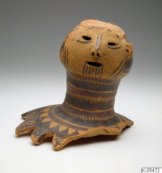 Huvud, terrakottafärjat lergods, bemålat i brunt och svart. Ögon och mun markerade hål. Pan-Shan typ neolitisk, Kina.