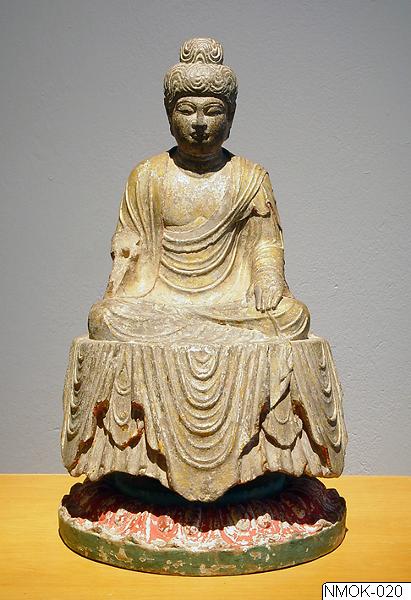 Buddha sittande på en draperad lotustron med benen hopvikta. den högra handen, som varit höjd, är avbruten, den vänstra vilar på knät. Han är iklädd en vid mantel, som lägger sig i tunna veck såväl över figuren som över den breda sockeln. Den bärande pelaren på piedestalen är senare tillfogad av trä, men fotplattan av sten torde vara gammal. Tang perioden ; början av 700-talet. Brunaktig sandsten med spår av förgyllning.