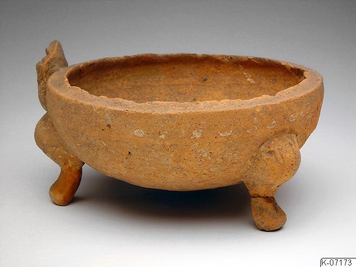 • Skålen står på tre fötter. Ett handtag finns och är avbrutet, sannolikt har ett likadant handtag funnits på motstående sida.