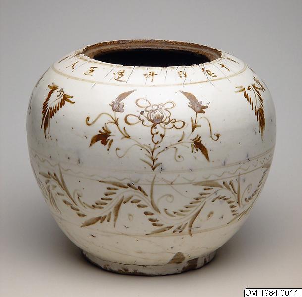 Kruka av guan-form med låg fotring och nersänkt, profilerad mynning. Stengods med gräddvit glasyr och dekor samt inskriptioner i brunt. Dekoren visar stiliserade blommor och rankor. Insida med temmoku-glasyr. Cizhou-vara.