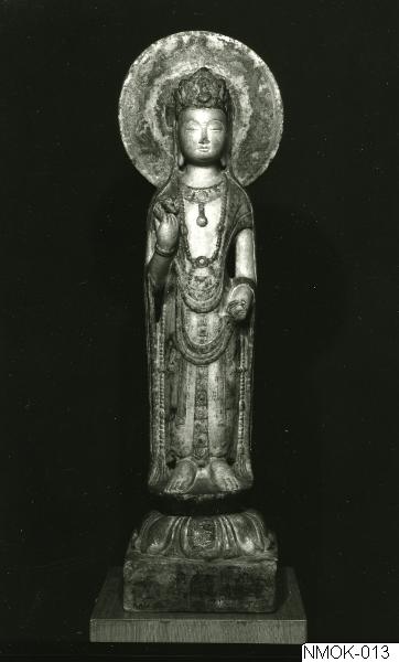 Antal delar: 2. Skulpturen står löst i en sockel som enligt utställningstext är av senare datum. Förvärvad i Peking 1929-30 av Osvald Sirén. Skulptur: Höjd 76 cm, bredd 24 cm. Sockel: Höjd 12,5 cm, bredd 20,5 cm.