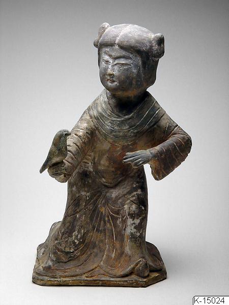 • Skulptur av målad keramik i form av kvinna med fågel, från Kina.