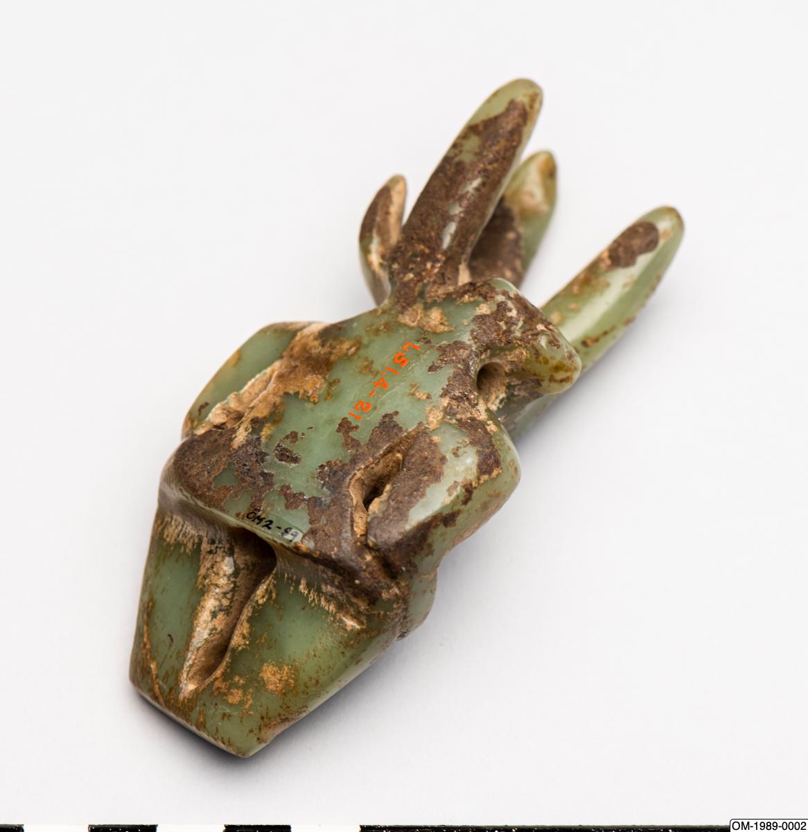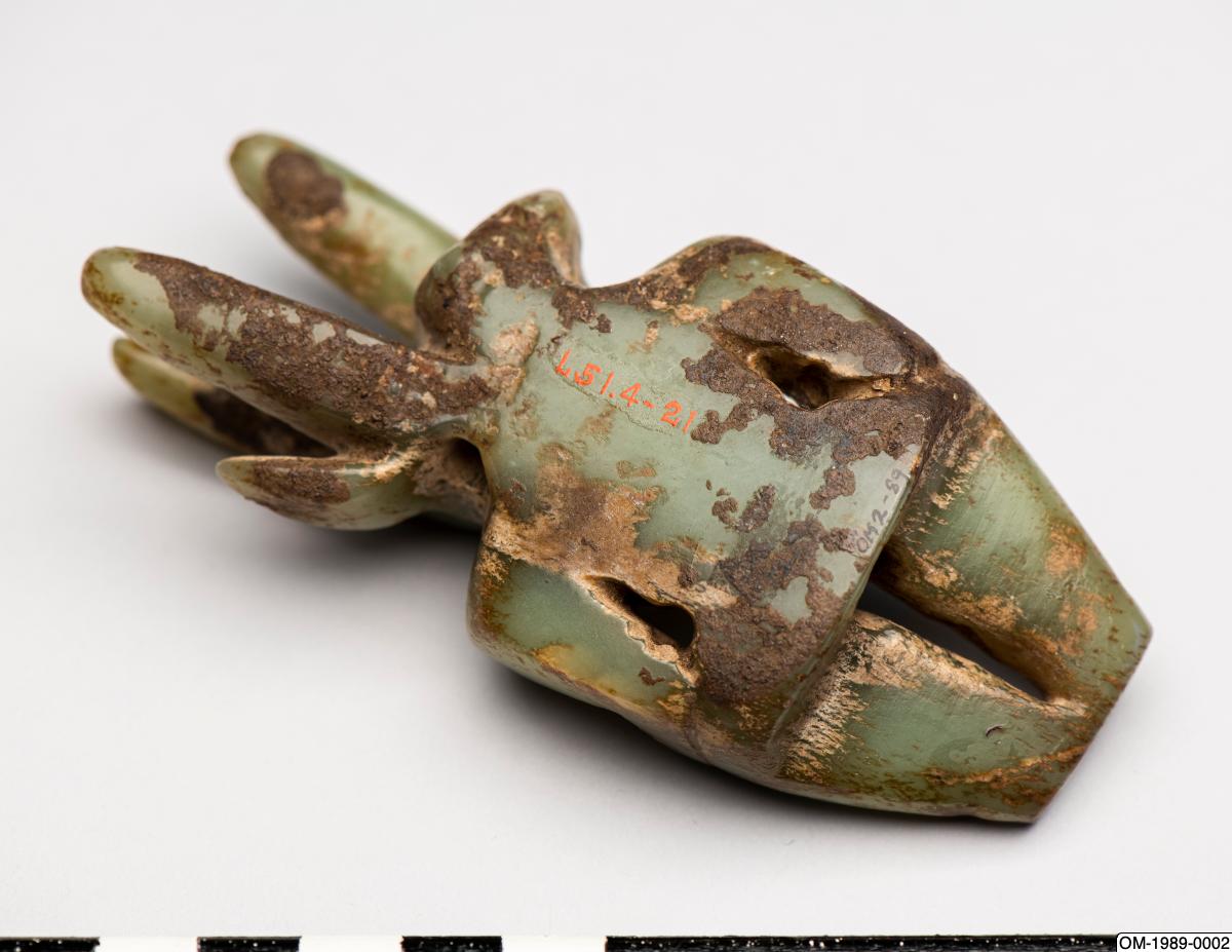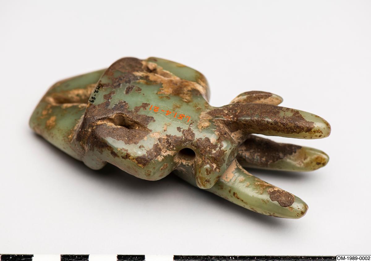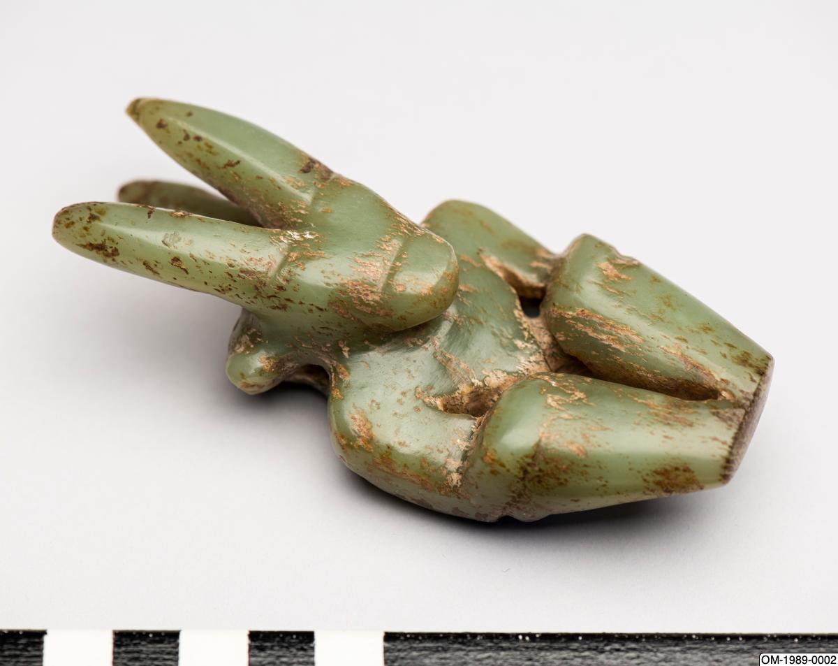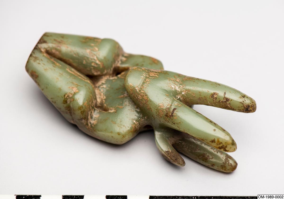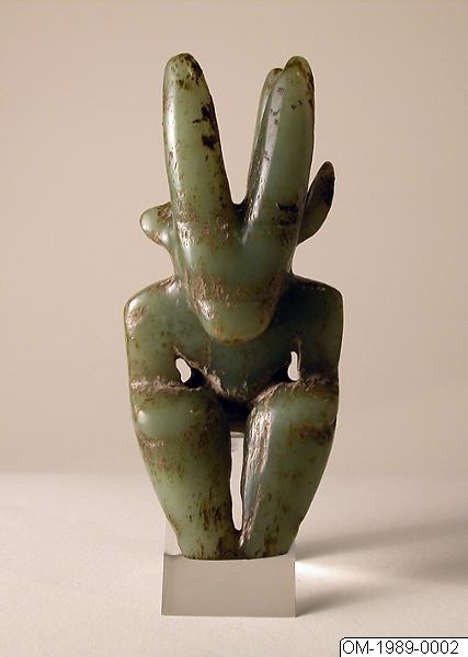 Figurin av jade med människokropp och djurhuvud. Sen jordbrukarstenålder, sannolikt Hongshan-kulturen. Tidigare i Ernest Ericksons samling. Gåva av Ernest Erickson Foundation 1989. OM-1989-0002