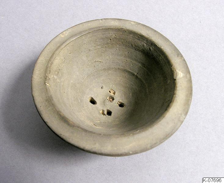Skålliknande kärl med botten perforerad av små hål.Höjd 4,5 cm, diam. 10 cm.