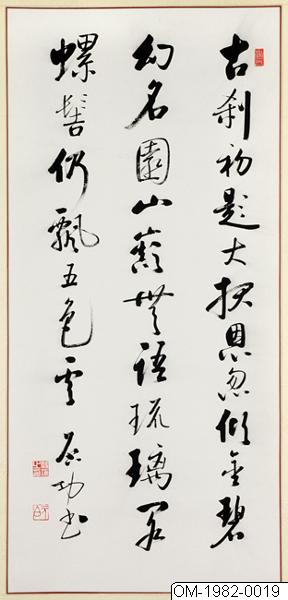 Kalligrafi i xingshu. Tusch på xuan-papper. Vertikalrulle. Qi Gong - född 1912 i Hebei provinsen. berömd kalligraf, känd som en av de tre gamla kalligraferna tillsammans med Fei Xinwo och Lin Sanzhi. Professor vid Shifan universitetet i Peking.