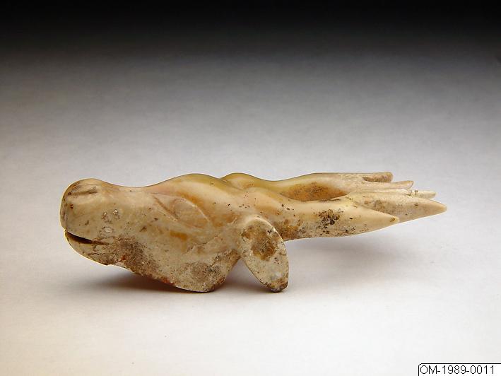 Hjorthuvud med förgrenade horn. På undersidan urholkad ränna. Elfenbensfärgad, delvis kalcifierad jade.