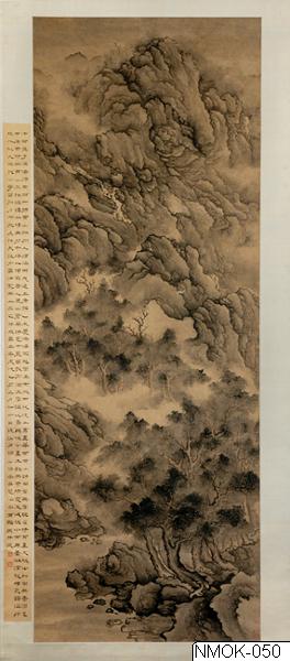 I ravinen, mellan de starkt söndersprängda bergen, störtar vattnet ner i strida strömmar. Dimman slingrar sig över vattnet och döljer delvis träden, som står i täta klungor på klippterasserna. I inskriptionen vid sidan av målningen från 1855 står det bl a att målningen är inspirerad av poesi från Tang-tid, ägnad åt bergens majestät, som visar tusen klippor och tiotusen grottor. Fa Ruzhen var också kalligraf, poet och författare. Han fick 1669 i uppdrag att leda vattenregleringen i Gula floden.