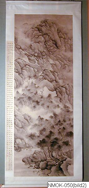 "Dimmor i bergsbygden." I ravinen mellan de starkt söndersprängda bergen störtar vattnet ner i strida strömmar. Dimman ligger i slingrande tågor över vattnet, delvis döljande träden, som står i täta klungor på klippterasserna. Vertikalmålning. Tusch på papper.