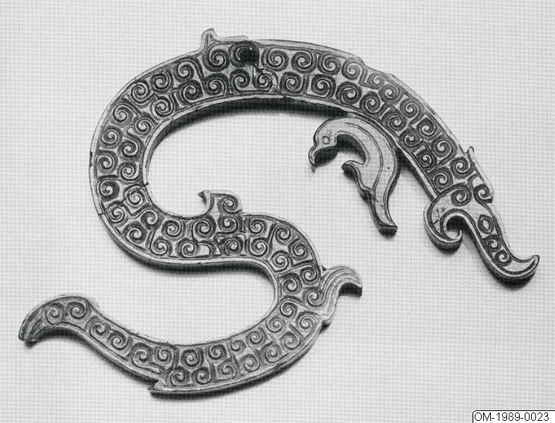 S-formad drake med spiraldekor. Under hakan fågelliknande fäna. Hål för upphängning (sannolikt inte ursprunglig). Grön och brun jade.